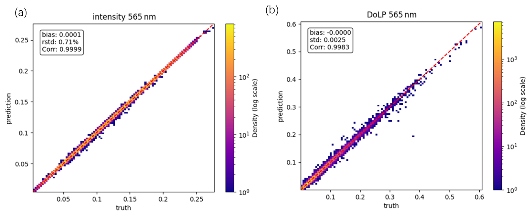 Figure 2Scatter plot of intensity and DoLP at 565 nm from NN forward model. The bias of both intensity and DoLP is close to zero. The rstd of intensity is 0.7 % and the std of DoLP is 0.0025. Both of them are below the instrument measurement noise, which suggests the NN forward model is good enough to replace the full physical model (RemoTAP) in estimating goodness-of-fit.