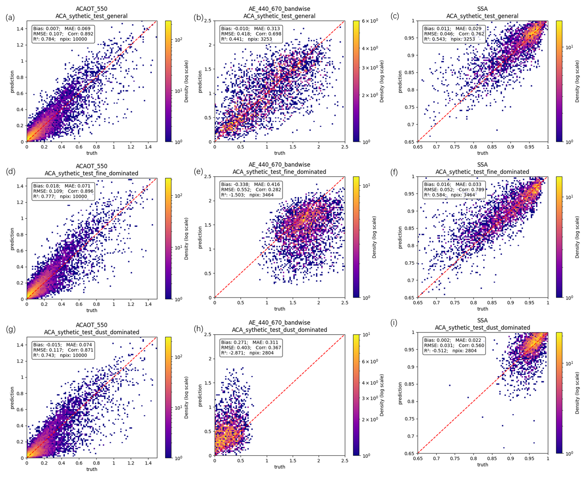 To test the compatibility of the algorithm for different aerosol conditions, we apply the NN to three datasets: (1) based on a uniform distribution of the fine-mode fraction between 0 and 1, as a baseline, (2) fine mode dominated cases only (fine-mode fraction >0.7), and (3) dust mode dominated cases only (fine-mode fraction <0.3). Details on the statistical distribution of the datasets can be found at Appendix B1. Figure 3 shows the scatter plot of ACAOT550, AE440–670, and SSA550 on the three datasets. The AE is calculated using ACAOT at 440 and 670 nm.