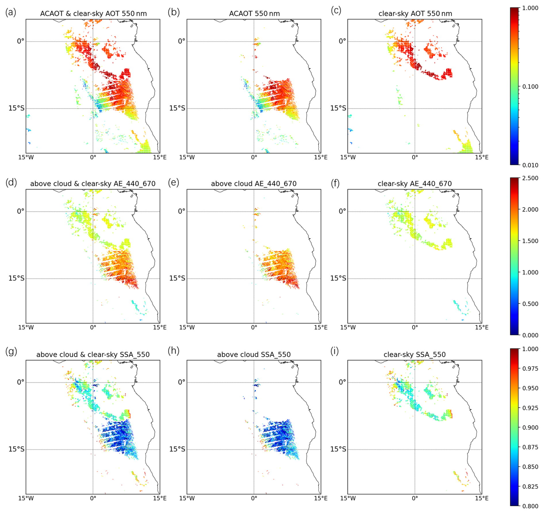 Figure 5ACAOT550 and clear-sky AOT550 (a, b, c), AE440–670 (d, e, f) and SSA550 (g, h, i) in mid-Africa, 4 August 2008. The left column (a, d, g) shows both the ACA and the clear-sky aerosol retrievals. The middle column (b, e, h) is the ACA retrievals and the right column (c, f, i) is the clear-sky aerosol retrievals. In this case, the ACA (mostly smoke) has a larger AE440–670 and smaller SSA550 than the adjacent clear-sky aerosols (smoke and sea salt).