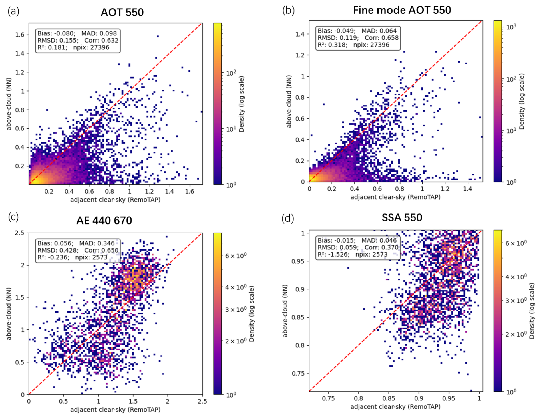 The retrievals are filtered by a retrieved liquid cloud fraction >0.8, ice cloud fraction <0.2, and the goodness-of-fit χ2 of the retrieval <5, all of which can be obtained from the NN for cloud mask and the NN forward model. For AE440–670 and SSA550, an additional mask of retrieved ACAOT550>0.2 is applied. The RMSE is 0.11 for ACAOT550, 0.42 for AE440–670, and 0.05 for SSA550 in the mixed dataset. In the fine-dominated dataset, it is 0.11 for ACAOT, 0.55 for AE, and 0.05 for SSA. For the dust-dominated dataset, the RMSE is 0.12 for ACAOT550, 0.40 for AE440–670, and 0.03 for SSA550. Potentially, the NN could be improved by adding more extreme cases to the training set, and this will be a subject of future work.