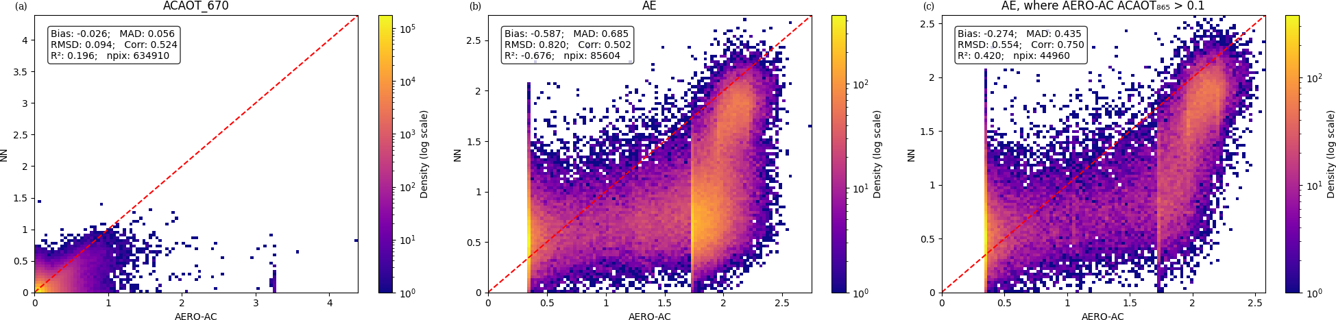 Figure 7Comparison of ACAOT670 (a) and AE (b) between PARASOL-NN and AERO-AC. AE from both PARASOL-NN and AERO-AC is filtered with ACAOT550>0.2 (ACAOT550 from AERO-AC is calculated with unfiltered AE and ACAOT670). (c) shows the AE comparison with an additional filter: ACAOT865>0.1 (from AERO-AC). Note the AE given by PARASOL-NN is between 440 and 670 nm while that by AERO-AC is between 670 and 865 nm.