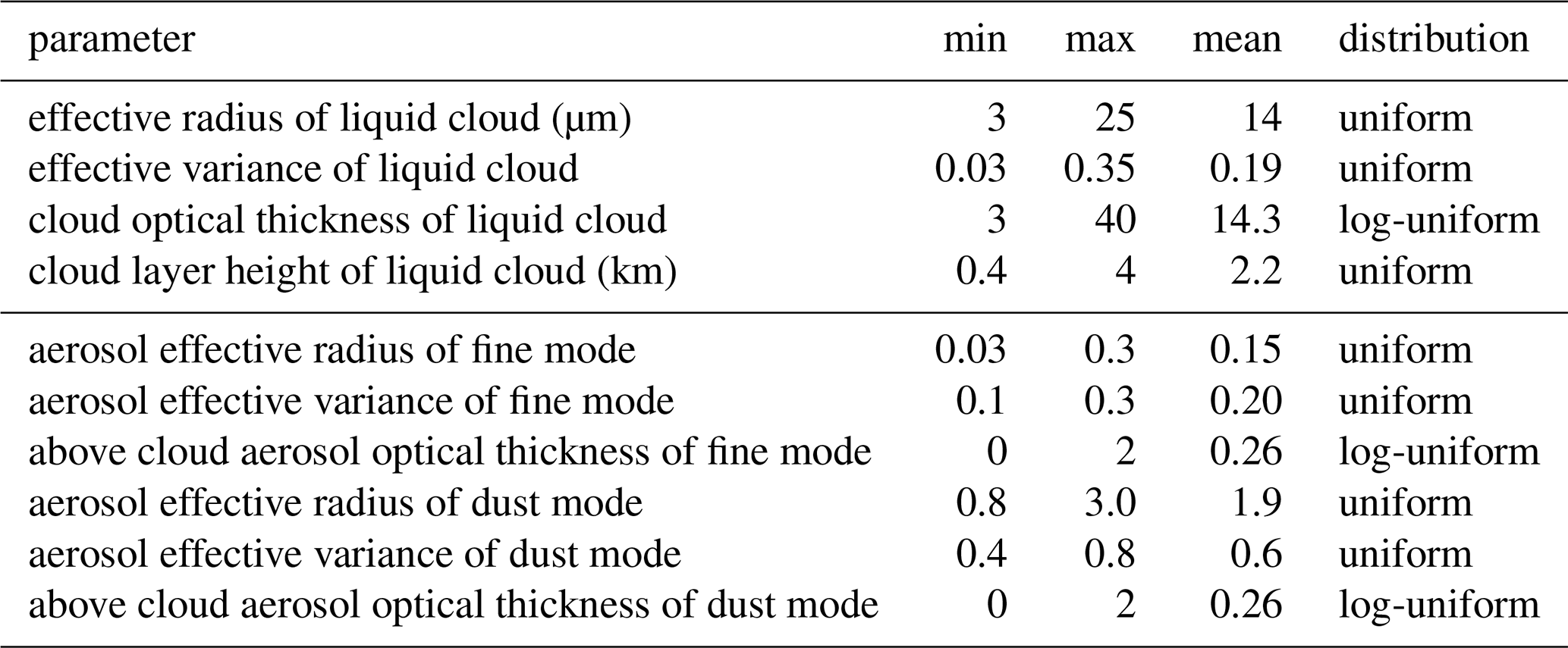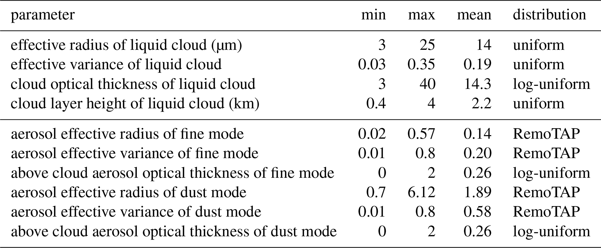 Table A3Details of the statistical distributions of the aerosol and cloud parameters used to generate the training datasets for NN forward model. The range of aerosol effective radius and effective variance for both fine mode and dust mode is smaller than that for the retrieval, because here it takes no extreme cases into account, which is relatively rare.