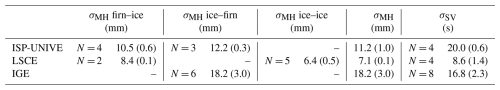 Table C1δ18O mean mixing lengths (σMH) at the stage of the melt head derived from the normal PDF calculated for N number of firn-to-ice, ice-to-firn, and ice-to-ice isotopic steps. The σMH is the mean value of all of the steps for each institute. The lengths are expressed in millimetres, accounting for the nominal melting speed, and the respective 1SD values are in parentheses. The σSV is obtained from the steps at the selector valve stage.