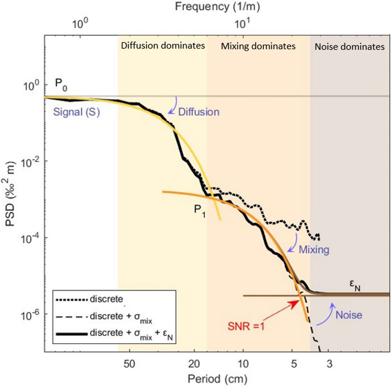 Figure 3Schematic PSD of discrete and simulated profiles. The simulated spectrum (solid black line) is obtained by combining the discrete power density (dashed black line) affected by natural diffusion in the firn (σdiff – yellow) with the mixing effect occurring in the CFA system (σmix – orange) and the measurement noise associated with continuous measurements (εN – brown).