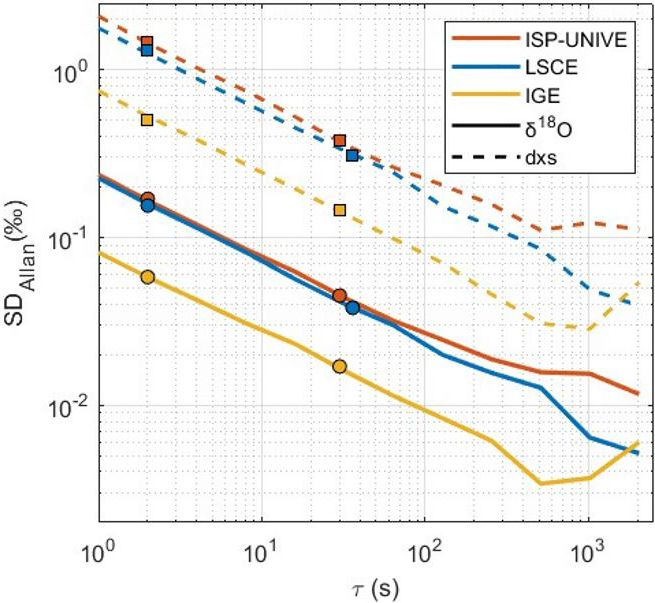 Figure 4Allan variance computed from 1 h continuous UPW flow for ISP-UNIVE (orange, at 14.850 ± 53 ppmv), LSCE (blue, at 20.380 ± 190 ppmv), and IGE (yellow, at 18.100 ± 105 ppmv) for δ18O and d excess. The dots and squares indicate, for each system, the specific integration times (τ) needed to melt 0.1 and 1.5 cm, respectively, of the ice core at the nominal melting rate.