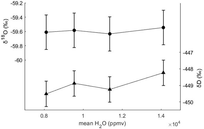 Figure 5Mean δ18O and δD values for the 3 min intervals selected at humidity levels of 8000, 9500, 11 500, and 14 000 ppmv in the ISP-UNIVE setup. The confidence levels are defined as the Allan variation for an integration time of 1 s (±1σ).