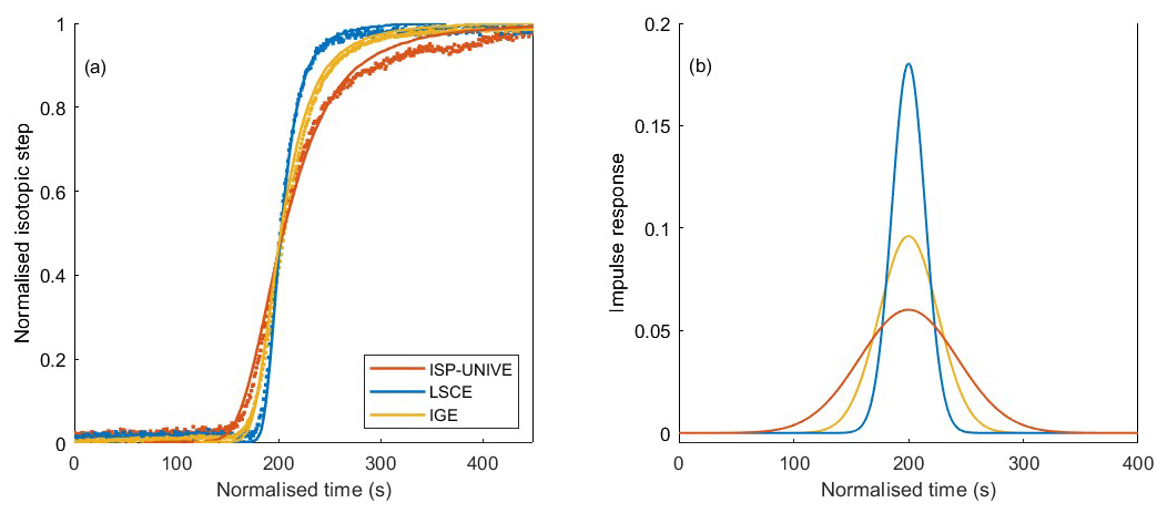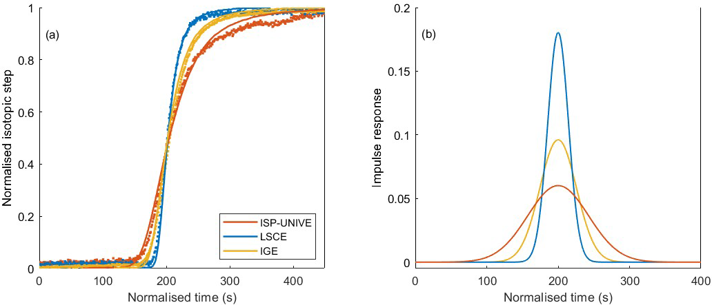 Figure 6(a) Raw data interpolated at 1 s post-acquisition and respective normalised transfer function for ice steps at the stage of the CFA melt head for δ18O. (b) Normal PDF impulse response function. Firn-to-ice transitions are shown for ISP-UNIVE and LSCE, while an ice-to-firn transition is shown for IGE.