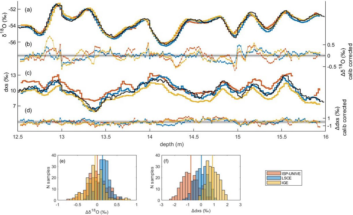 Figure 7(a, c) Comparison of discrete δ18O and d-excess profiles (black lines) for the depth interval of 12.5–16 m with integrated discrete records built from CFA measurements for ISP-UNIVE (orange), LSCE (blue), and IGE (yellow). The histograms in (e) and (f) represent the distribution of the difference between discrete data and discrete records built from CFA measurements. Panels (b) and (d) show the difference between discrete data and discrete records built from CFA measurements corrected for calibration. The horizontal grey areas represent the uncertainties of the discrete analysis for δ18O and d excess.