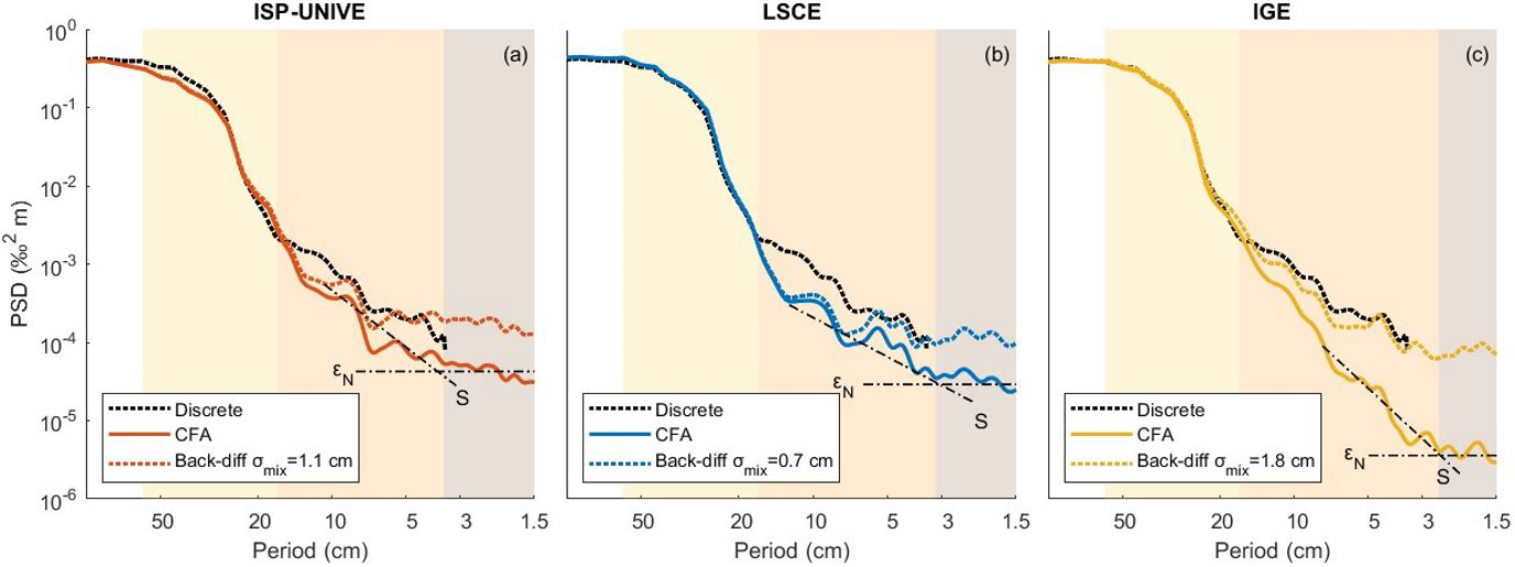 In this section, we conduct a PSD analysis on continuous and discrete results (Fig. 8) to assess the impact of mixing on continuous measurements and to determine the frequency limit at which the measurement noise begins to dominate over the signal. The continuous data have a post-processed resolution of 0.5 cm, while the discrete samples have a resolution of 1.7 cm. Diffusion, with a length of 6–8 cm in firn, begins to smooth the climatic signal at periods around 50 cm (as observed in the yellow areas of Fig. 8). In the range of 20–50 cm (yellow area), diffusion emerges as the dominant process shaping the spectra. At smaller scales (3–20 cm – orange area), however, additional mixing, characterised by mixing lengths of a few centimetres, further attenuates the power preserved in the discrete spectrum. This power is not only associated with instrumental noise but may be attributed to additional post-depositional processes occurring in parallel with or after diffusion, which will not be investigated in this study. The frequency limit for reliable isotopic measurements corresponds to the intersection of the smoothed signal (dashed black lines, S) and the noise flat spectrum (brown areas, dashed black lines, εN), where the SNR is equal to 1. These resolution limits are 1.8 cm for ISP-UNIVE, 1.6 cm for LSCE, and 1.3 cm for IGE. While the effects of mixing can be corrected by applying back-diffusion to the signal, attempting this on frequencies dominated by measurement noise would result in an artificial amplification of that noise. However, as the primary objective of this study is to provide a straightforward approach for determining the resolution at which measurement noise begins to dominate the signal, the records will be custom block averaged at that determined resolution. This process effectively removes measurement noise, additionally removing the amplification of noise that could result from back-diffusion process.