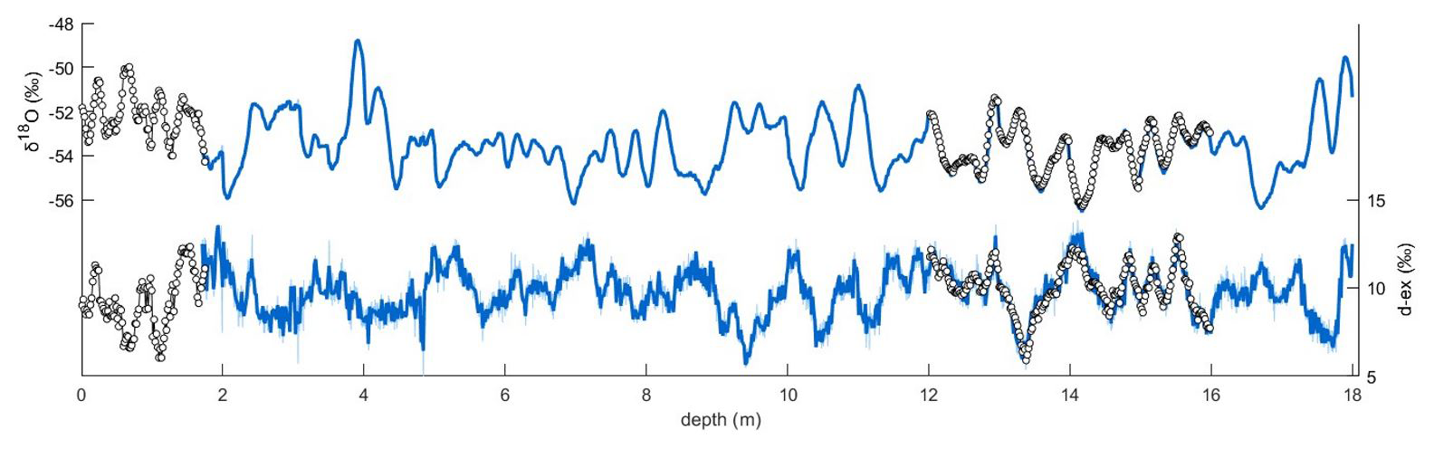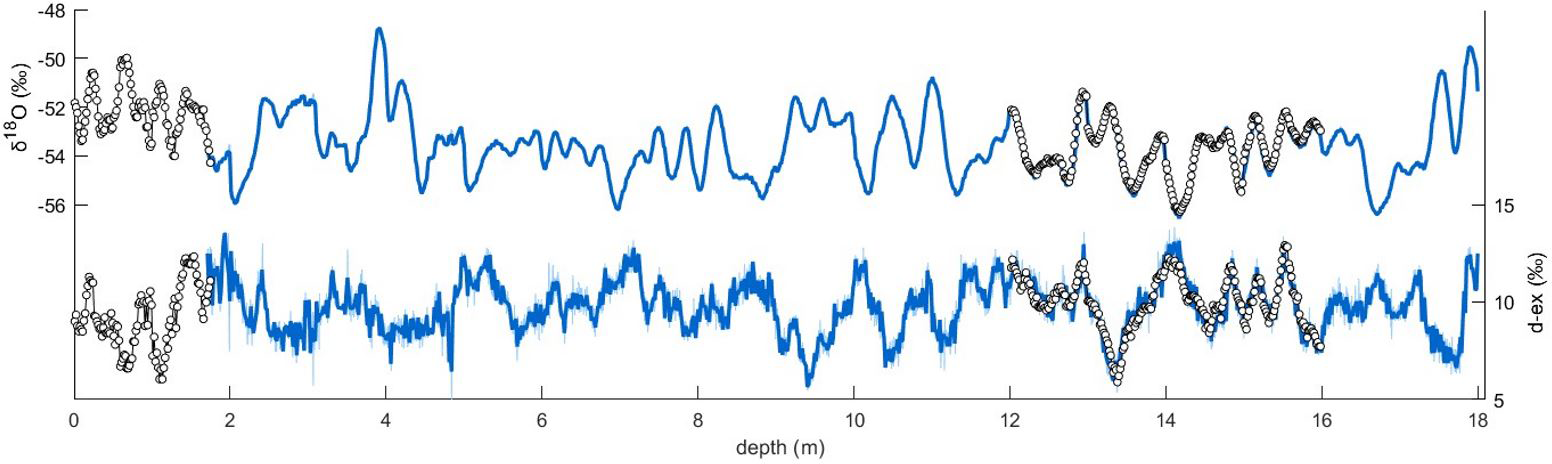Figure 9The 18 m PALEO2 core analysed with the CFA-CRDS system at LSCE. The δ18O and d-excess profiles of the raw data (light blue), block-averaged at 1.6 cm data (blue), are shown with the discrete results (white dots).