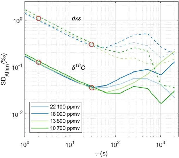 Figure A1δ18O and d-excess Allan variance computed from 1 h continuous UPW flow for humidity levels ranging from 10 000 to 20 000 ppmv. Red circles indicate integration times (τ) equal to 2 and 30 s, needed to melt 0.1 and 1.5 cm, respectively.