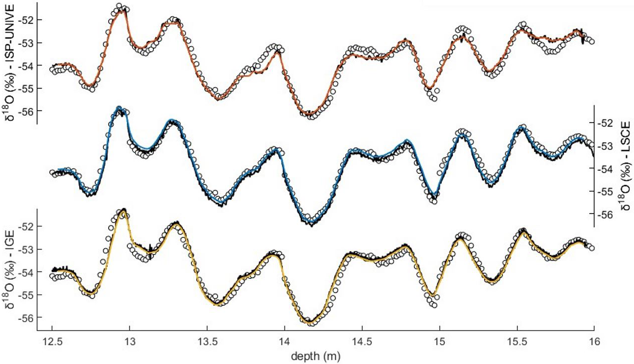 The mixing lengths (σMH, σSV, and σL) are summarised in Table 4. Since the values for δ18O and δD are very similar, we report only δ18O. The resulting mean σMH values are 7.1 mm for LSCE, 11.3 mm for ISP-UNIVE, and 18.2 mm for IGE. Values expressed in seconds are converted into millimetres using the average melting rate.