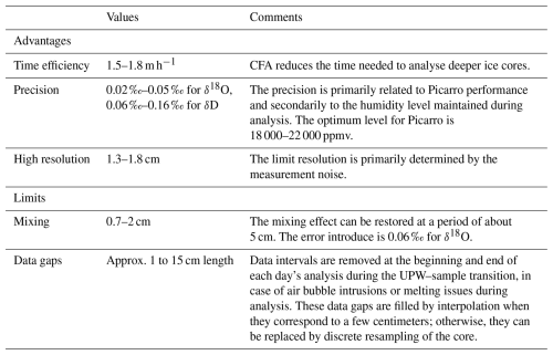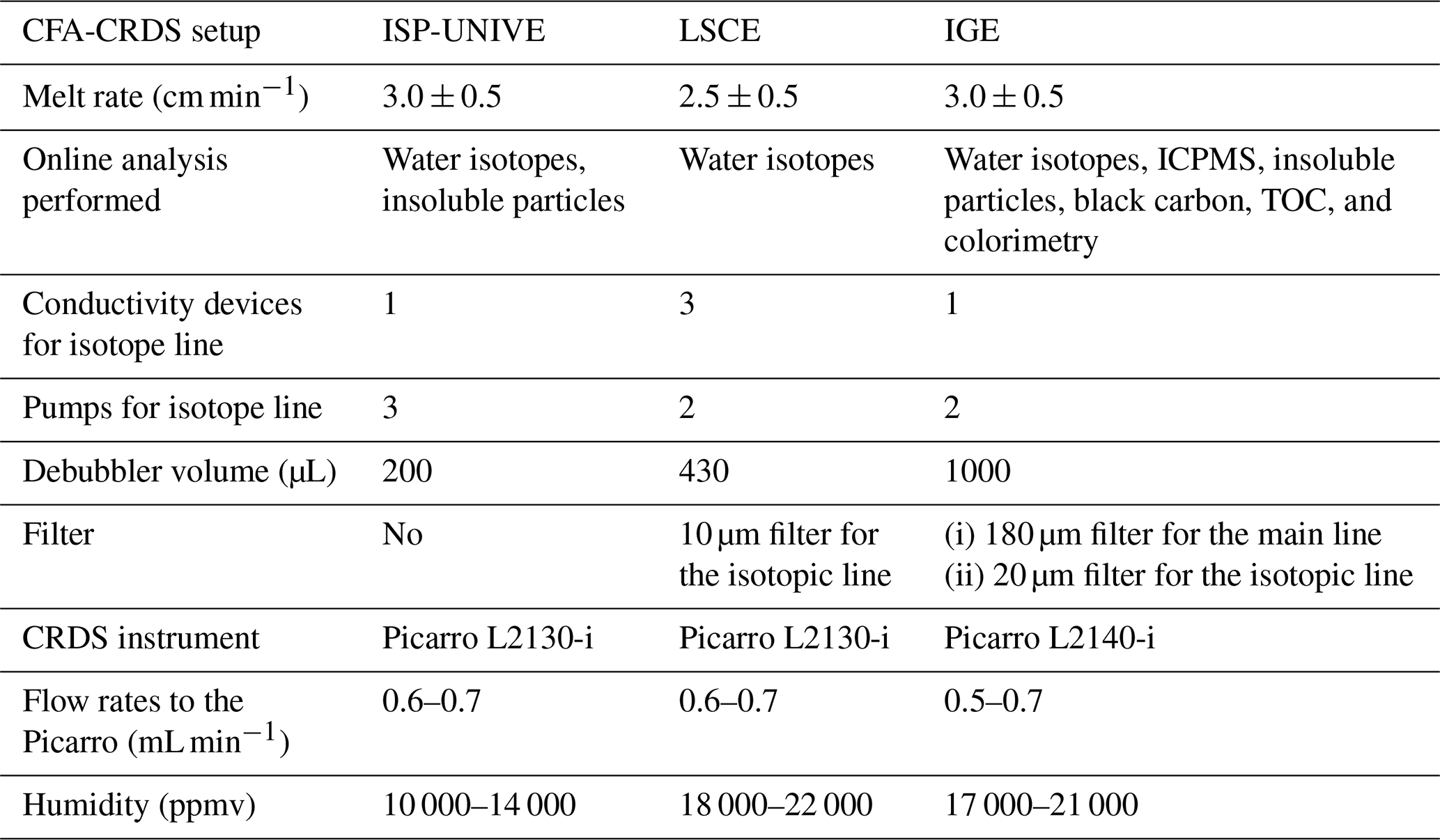 The technical intercomparison of the three CFA-CRDS systems developed at ISP-UNIVE, LSCE, and IGE highlighted each system's strengths and identified opportunities for future optimisation and development. Operating at a melt rate of 2.5–3 cm min−1 under stable conditions, these systems measure 8–10 m of firn core per day, confirming that CFA-CRDS is a fast, high-resolution method for isotope analysis, with precision comparable to the discrete method. For ISP-UNIVE-CFA and LSCE-CFA systems, the main limitation in achieving a higher resolution is imposed by the performance of the analyser. Conversely, the IGE-CFA system, with the great advantage of providing chemistry measurements online, has a setup limitation related to its longer distribution line and higher volume debubbler, which promotes mixing. To optimise system performance, it is crucial to set a melt rate high enough to ensure sufficient flow for all instruments and fraction collectors in the CFA system while minimising excessive mixing at the melt head and in the tubing and without extending the duration of the CFA campaign for melting the core.