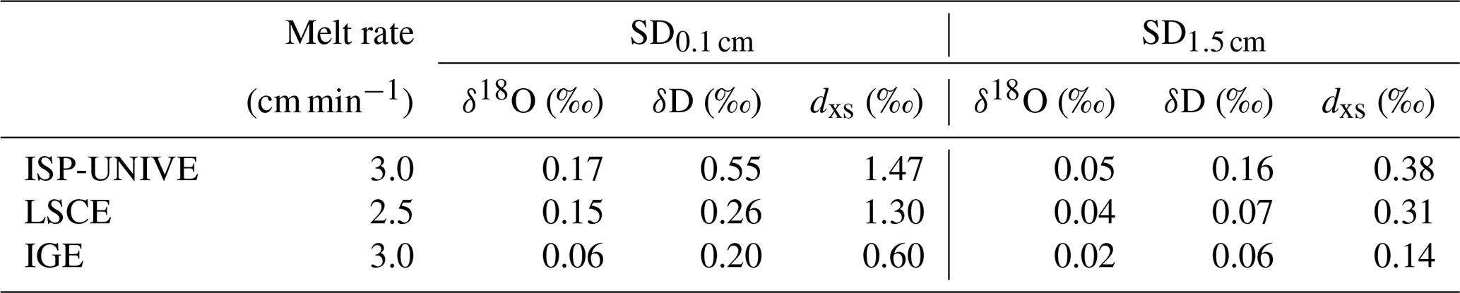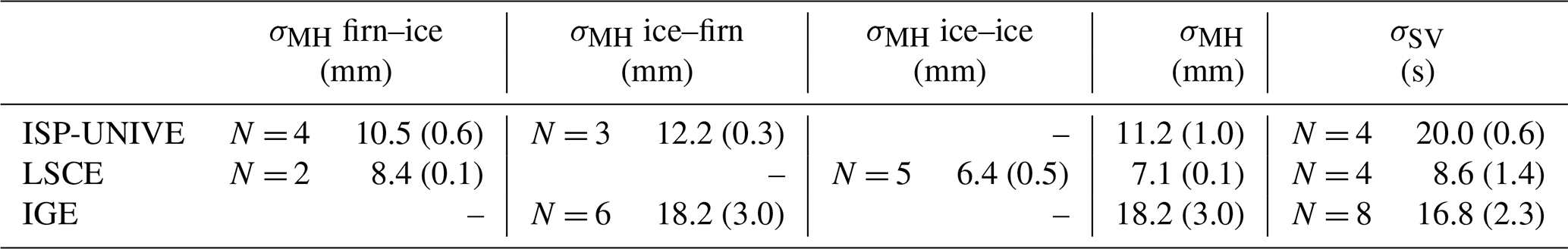 Table C1δ18O mean mixing lengths (σMH) at the stage of the melt head derived from the normal PDF calculated for N number of firn-to-ice, ice-to-firn, and ice-to-ice isotopic steps. The σMH is the mean value of all of the steps for each institute. The lengths are expressed in millimetres, accounting for the nominal melting speed, and the respective 1SD values are in parentheses. The σSV is obtained from the steps at the selector valve stage.