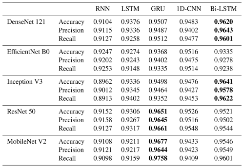 The SPTV dataset was split into training, validation, and test datasets according to the ratio of . Training and validation sets were employed to construct the deep learning model. To analyze the performance of the proposed method, some classical CNN models with ImageNet pre-trained weights such as: DenseNet 121 (Huang et al., 2017), EfficientNet B0 (Tan and Le, 2019), Inception V3 (Szegedy et al., 2016), and ResNet 50 (He et al., 2016) are used to extract the spatial features of precipitation images, while some commonly used neural networks for temporal signal analysis like RNN, LSTM, 1D-CNN (Kiranyaz et al., 2021), and Bi-LSTM (Huang et al., 2015) are employed to extract the temporal features of precipitation surveillance videos, respectively. In terms of realization, transfer learning is exploited, and the last layer of each spatial extraction architecture (i.e., the fully connected (FC) and Softmax layers) was deleted and replaced with two layers: GAP and BN, to extract the deep spatial features based on transfer learning. Second, the spatial features were sent to temporal feature extraction networks listed above. The Softmax function was used as a classifier to identify SPT. Thus, a total of 25 deep-learning algorithms are constructed and compared. The hyper-parameters deep-learning models were set as listed in Table 3.