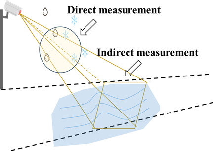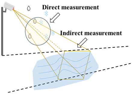 Figure 1Weather classification using traffic surveillance cameras. Direct measurement methods focus on the image/video features exhibited during the precipitation particle's falling process, while indirect measurements involve snow or water accumulation on the ground.