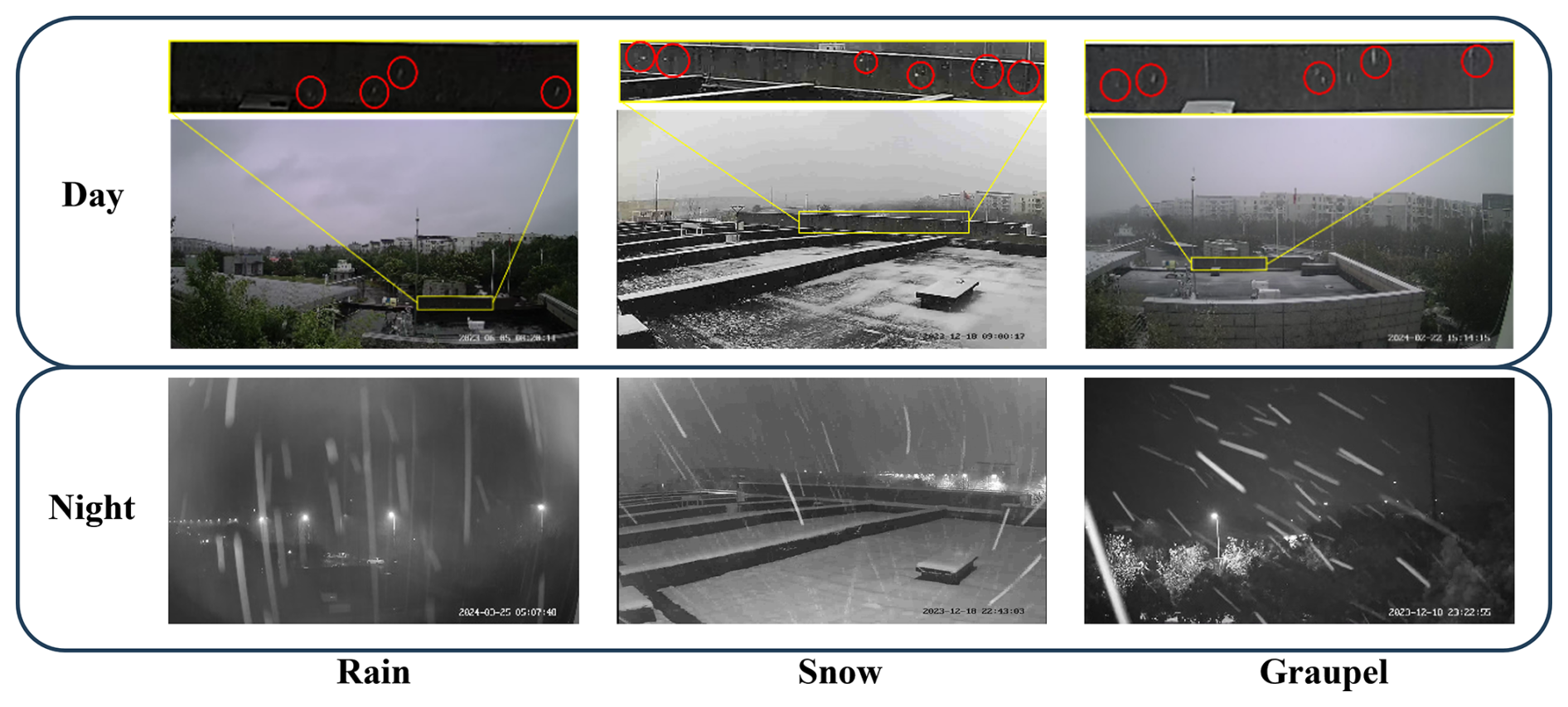 Figure 3Comparison of rain, snow, and graupel in day and night surveillance images (Particles are labelled by red circles). Differences in image features such as brightness, color, and trajectory exhibited by rain, snow, and graupel in daytime visible light and nighttime near-infrared images, due to their varying optical properties, interactions with light, and terminal fall speeds.