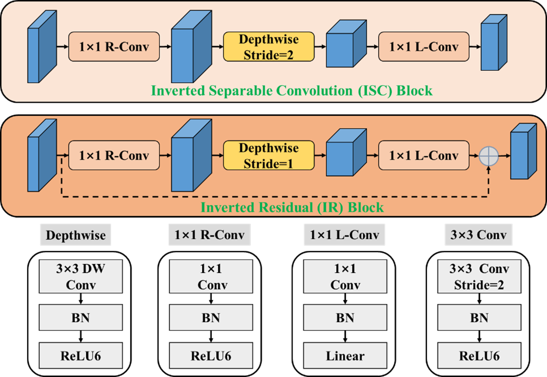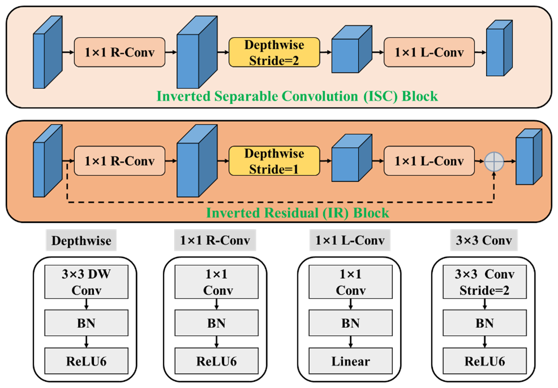 ISC block: This block utilizes a 1×1 convolution with batch normalization and a ReLU6 activation function (1×1 R-Conv) to expand the number of channels in the input feature map. It then calculates the feature maps through depth-wise convolution (DW), after which the number of channels is reduced using a linear 1×1 convolution.