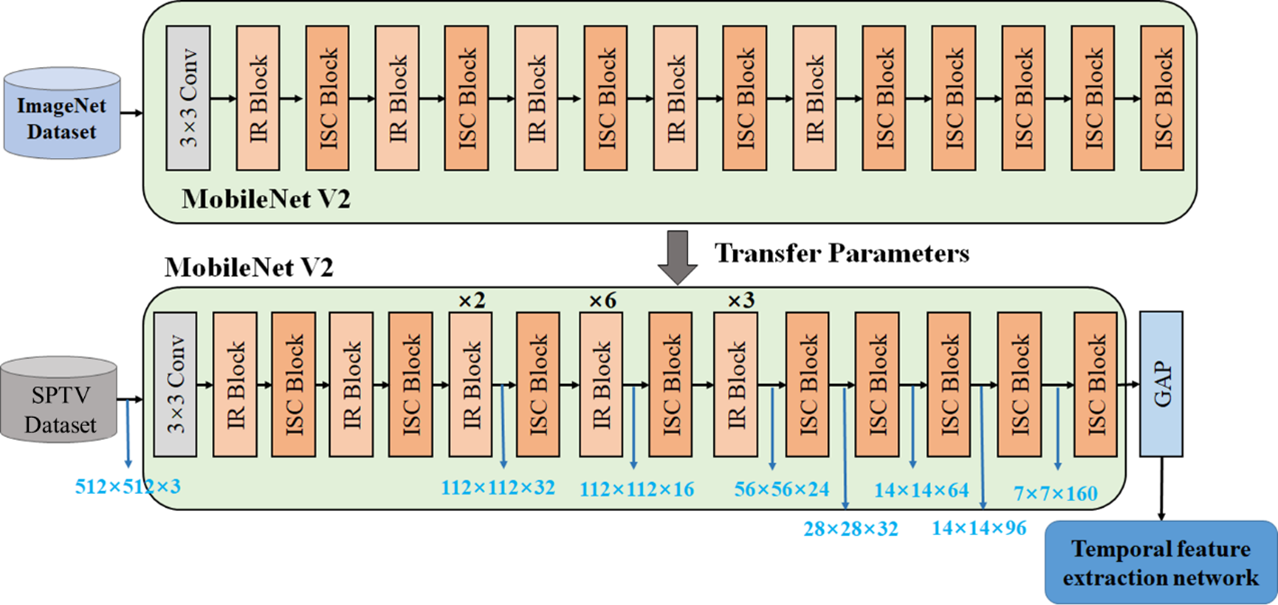 Transfer learning involves leveraging knowledge from one task to inform another, eliminating the need for feature extractors to be trained from scratch. This approach accelerates training, reduces the risk of overfitting, and enables the construction of accurate models more efficiently. Previous research has shown that pre-trained models, developed using extensive datasets like ImageNet, offer an excellent foundation for new tasks where dataset size is limited. Consequently, the final two layers of MobileNetV2 were removed and replaced with global average pooling (GAP), batch normalization (BN), and temporal feature extraction layers (detailed in Sect. 3), including GRU layers. Finally, the pre-trained MobileNetV2, fine-tuned on the ImageNet dataset, was adapted through transfer learning to extract spatial features of SPT from surveillance images.