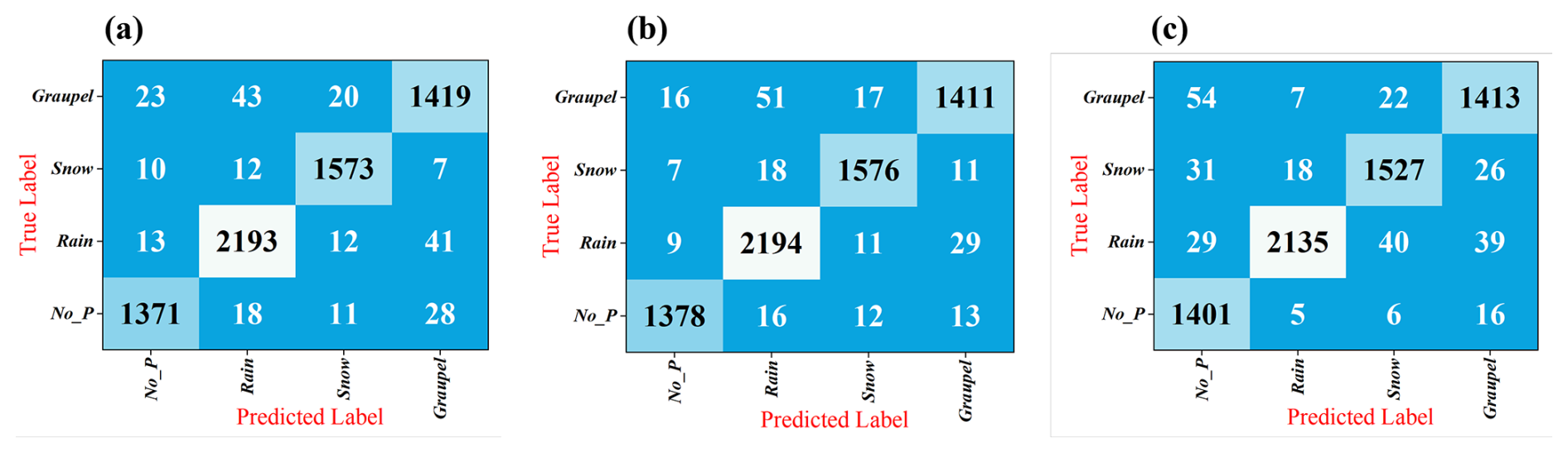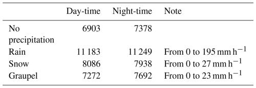 Near surface precipitation type (SPT) refer to any atmospheric particle consisting of liquid or solid water, which are integral to precipitation processes and play a crucial role in the water cycle and cloud microphysics (Pruppacher and Klett, 1980). Despite SPT and ground conditions (i.e., snow or rain on ground) are related, note that they are different. The identification of SPT contributes to the improvement of quantitative precipitation estimation algorithms and promotes the understanding of precipitation microphysical processes, thus providing scientific support for the improvement of microphysics scheme of numerical weather prediction. Common examples of SPTs include rain, snow, graupel. They account for more than 90 % of the SPT and influence urban transportation, communication, electricity, and other industries (Casellas et al., 2021a; Zhou et al., 2020). Especially in winter, a weather process may contain multiple SPTs and often co-exist or convert to each other. Given the same amount of precipitation, the impacts of different SPTs may vary considerably (Leroux et al., 2023). For example, if 5 mm of precipitation falls in 24 h, it is only light rain for the liquid precipitation but heavy snow for the solid precipitation, severely influencing social production and life. In winter, when snow, rain, and graupel co-exist or alternate frequently, it is tough for forecasters to know the actual weather conditions, which seriously affects the quality of forecasts (Haberlie et al., 2015). Therefore, the accurate discrimination of the SPT, especially for the rain, snow, and graupel, has significant scientific and practical value.