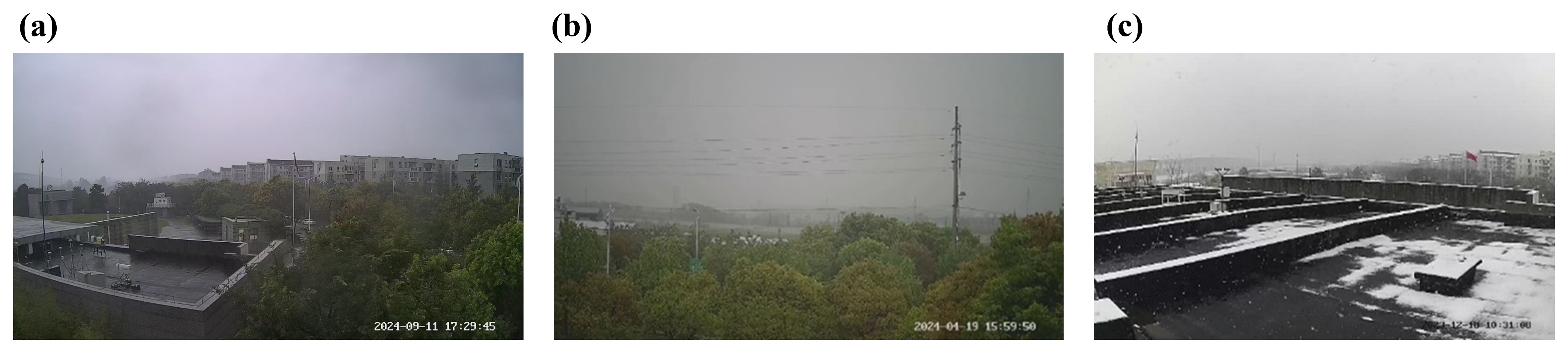 Strong winds may also cause camera shake, blurring precipitation images in the surveillance field of view. Under strong wind conditions, the movement trajectories of precipitation particles become unstable, and rain droplets, snowflakes, and other particles may be scattered by the wind, as shown in Fig. 15c. This not only alters their fall paths but may also cause the precipitation patterns to become unclear, increasing the complexity of algorithmic interpretation.