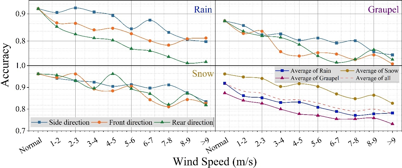 Next, we evaluate the performance of the proposed method in real precipitation scenarios. The 2-DVD measurements, calibrated through simultaneous observations by researchers, are used as the true value to validate the effectiveness of the verification method. Here, six precipitation events are selected, including three types of precipitation scenarios: rain, snow, and shrapnel from day-time to night-time, and the duration of each precipitation event is 2 h. More details about each precipitation event are presented in Table 7. Considering the impact of wind on the trajectory and falling speed of precipitation particles, we have taken further measures to enhance the robustness and accuracy of the model. Specifically, we installed an anemometer next to the surveillance camera to capture real-time changes in wind speed and direction. This measure provides the model with relevant wind field data to better account for wind interference when predicting SPT. Since the orientation of the surveillance camera is generally fixed, the wind direction data collected by the anemometer can be combined with the camera's viewpoint to calculate the relative orientation of the wind to the camera lens.