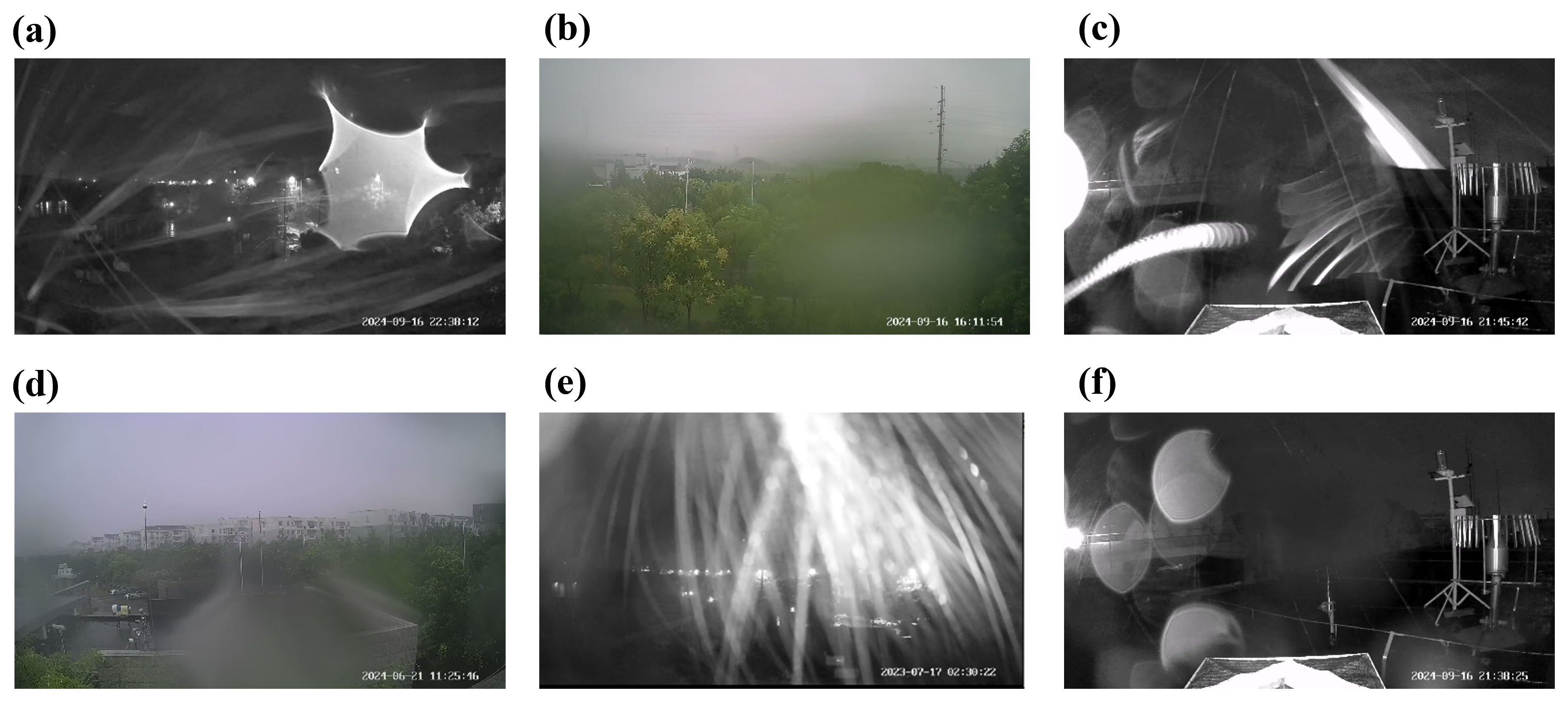 Figure 15Different types of surveillance image quality degradation: (a) Drop attachment on lens at night, (b) daytime drop attachment on lens, (c) wind caused image blurred, (d) mist caused lens blurred, (e) lightning-induced exposure anomalies, (f) dust caused image blurred. These special cases can be regarded as scenarios where our proposed method fails to work.