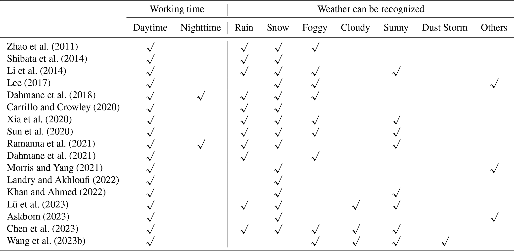 Table 1 presents a comparison of surveillance camera-based weather classification/recognition algorithms. Since ordinary surveillance cameras differ in the images captured during daytime and nighttime, the working time is divided into daytime and nighttime (low-light scenarios are categorized as nighttime). Moreover, the weather types that can be recognized/classified are also listed. Combined with previous review and analysis, we can summarise: