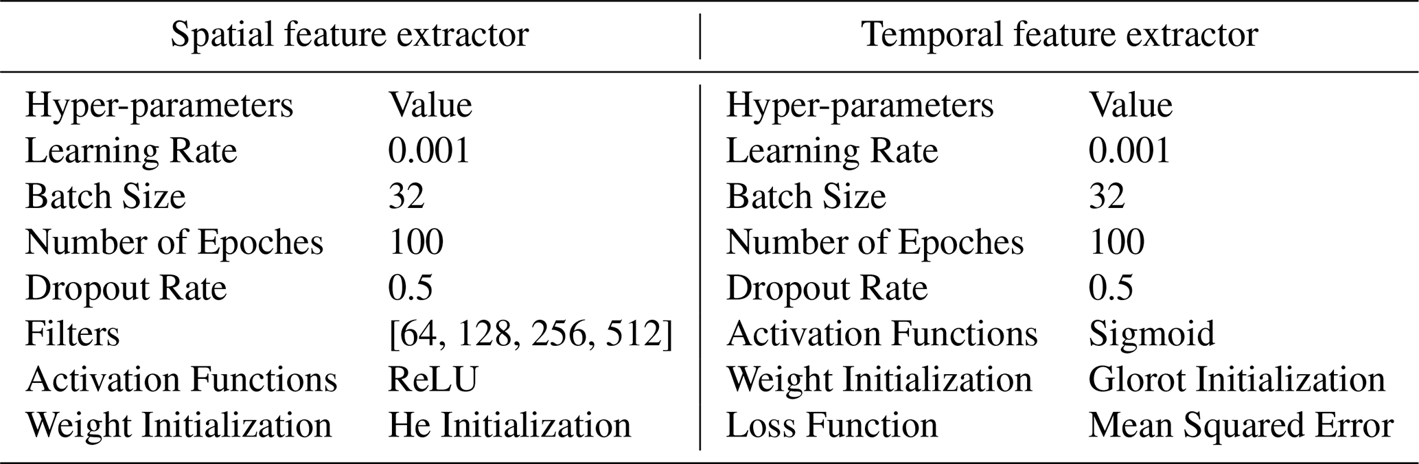 The SPTV dataset was split into training, validation, and test datasets according to the ratio of . Training and validation sets were employed to construct the deep learning model. To analyze the performance of the proposed method, some classical CNN models with ImageNet pre-trained weights such as: DenseNet 121 (Huang et al., 2017), EfficientNet B0 (Tan and Le, 2019), Inception V3 (Szegedy et al., 2016), and ResNet 50 (He et al., 2016) are used to extract the spatial features of precipitation images, while some commonly used neural networks for temporal signal analysis like RNN, LSTM, 1D-CNN (Kiranyaz et al., 2021), and Bi-LSTM (Huang et al., 2015) are employed to extract the temporal features of precipitation surveillance videos, respectively. In terms of realization, transfer learning is exploited, and the last layer of each spatial extraction architecture (i.e., the fully connected (FC) and Softmax layers) was deleted and replaced with two layers: GAP and BN, to extract the deep spatial features based on transfer learning. Second, the spatial features were sent to temporal feature extraction networks listed above. The Softmax function was used as a classifier to identify SPT. Thus, a total of 25 deep-learning algorithms are constructed and compared. The hyper-parameters deep-learning models were set as listed in Table 3.
