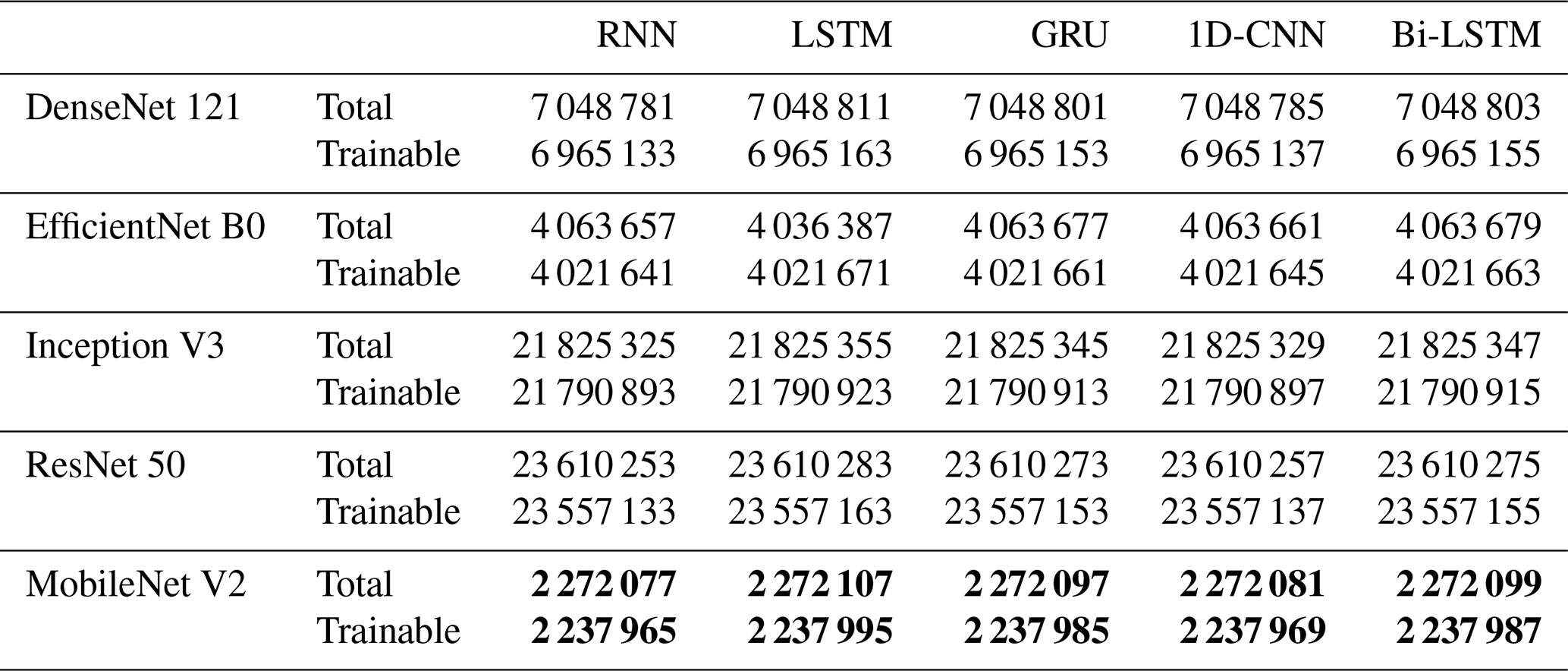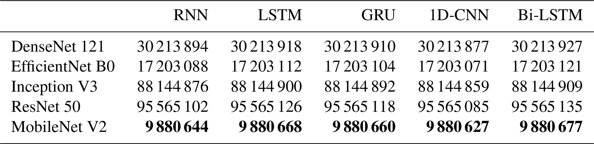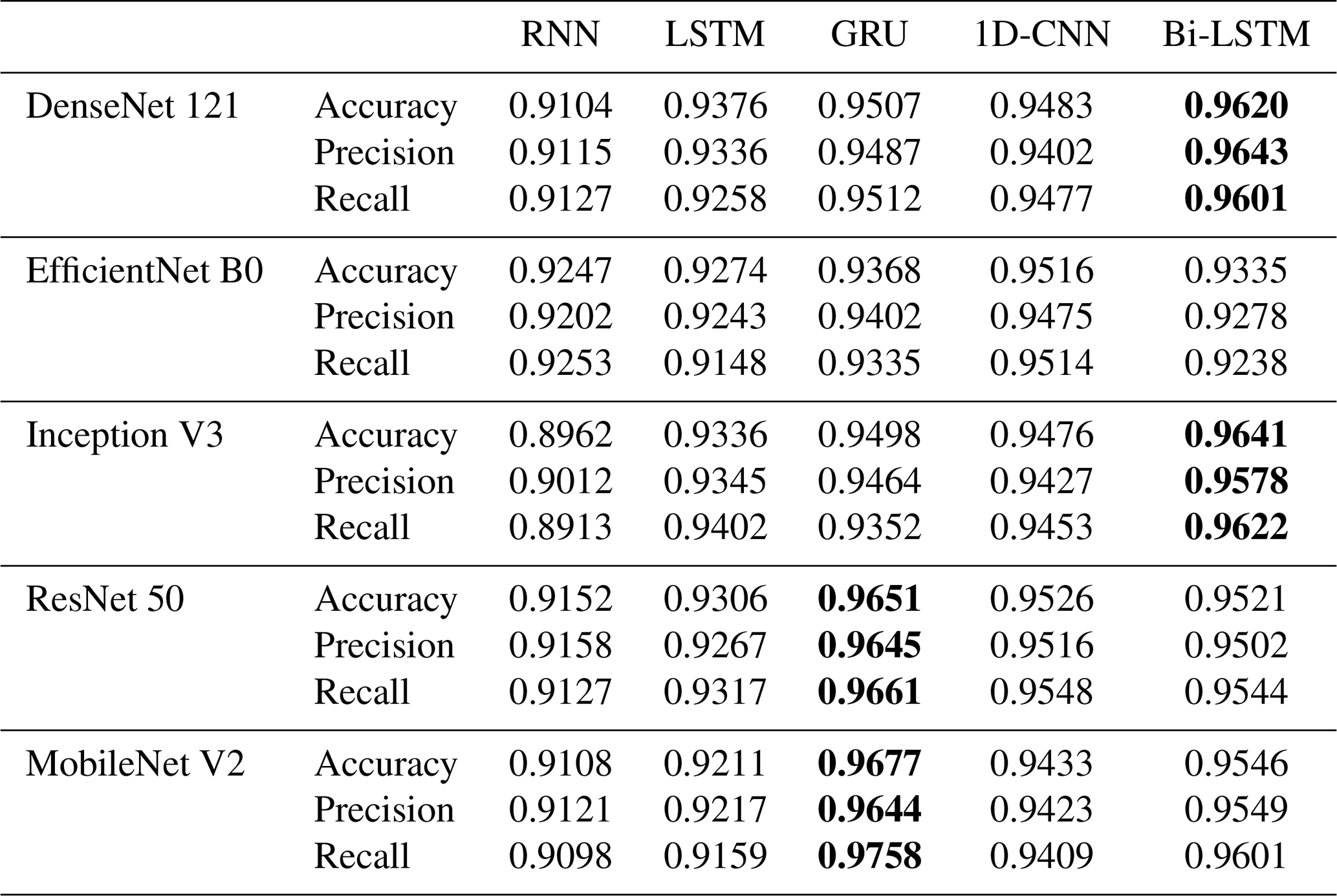 The results indicate that when the number of frames (NFS) is set to 5, the accuracy of our proposed method closely aligns with those of the DenseNet 121+GRU, ResNet 50+LSTM, and MobileNet V2+1D-CNN models. When the NFS is increased to 10, the performance of our proposed method, DenseNet 121+Bi-LSTM, Inception V3+Bi-LSTM, and ResNet 50+GRU converges, showing minimal differences in classification accuracy, which ranges from 0.960 to 0.967. However, with NFS at 15, the accuracy of our proposed method surpasses that of DenseNet 121+GRU and ResNet 50+1D-CNN models, though it slightly declines to approximately 0.949 to 0.957.