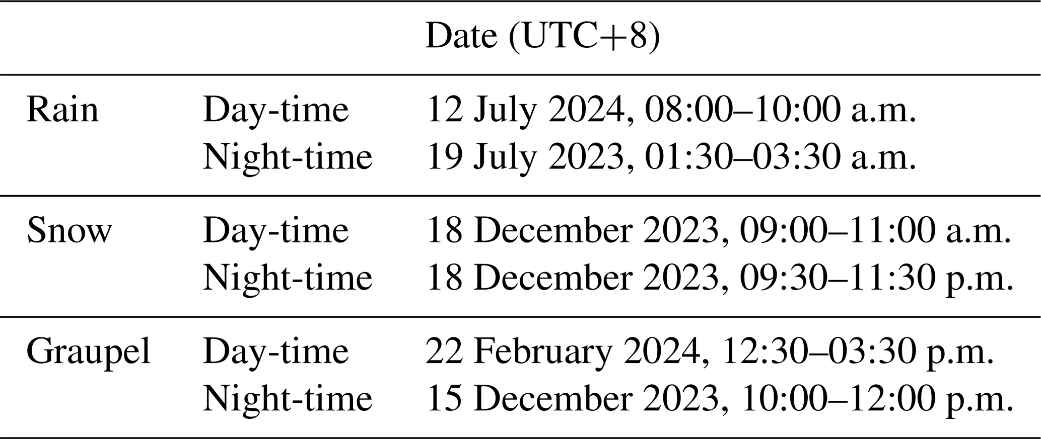 In terms of weather: It can be found from Table 1 that the existing works have not yet paid attention to the distinction of graupel, which is more challenging due to its similarity to rain and snow particles.