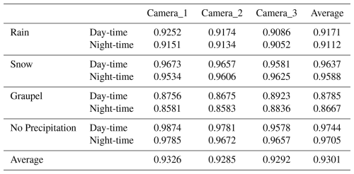 Furthermore, Fig. 9 illustrates occasional misclassification between “no precipitation” and other SPTs. Upon analysing the SPTV dataset, it was observed that these errors typically occurred during low-intensity precipitation events, where only a minimal number of rain, snow, or graupel particles were present. While the 2-DVD device – known for its high sensitivity – can detect such subtle precipitation events, capturing these minute particles in surveillance videos remains challenging, particularly when affected by lighting conditions and external environmental factors within the camera's field of view.