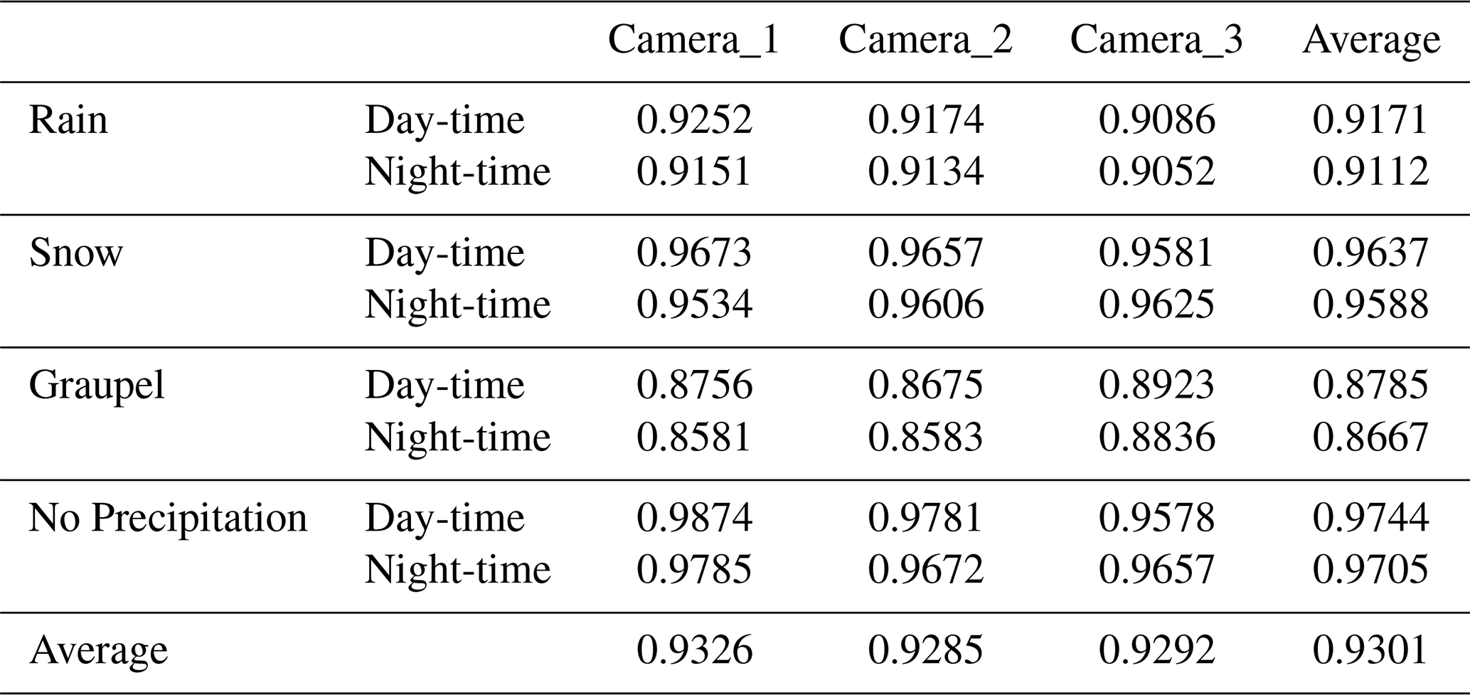 In addition, the Two-Dimensional Video Disdrometer (2-DVD), a professional precipitation measurement instrument, works in synchronization with the surveillance cameras to provide the true value/label of the SPT for the surveillance videos. Simultaneous observations by researchers are also conducted, and their observed data are used to refine the 2DVD measurements, ensuring the accuracy of the true value/label of SPT. The precipitation intensity values are calculated every minute. Therefore, the values in Table 2 refers to the precipitation intensity during a 1 min period, not an hourly intensity. The maximum distance between the 2DVD and the camera is 1 km, which ensures that the SPT observed by the two is the same.