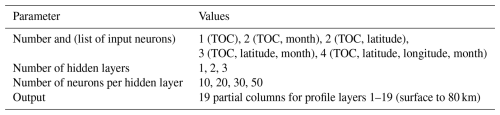 One of the main objectives of this study – in addition to merging profiles from the individual sensors – is the development of an altitude-dependent scaling approach that can be applied to the merged profiles from Sect. 3 in order to match the total ozone columns provided with the GTO-ECV data record. For this purpose, we use the standard feed-forward neural network algorithm implementation developed by Molina García (2022), which offers the possibility to extract derivatives with respect to the input variables, e.g., total ozone. These derivatives are obtained by automatic differentiation (Molina García et al., 2018), and they provide information about the altitude-dependent change in the profile as a result of a change in the total column. For each of the 11 classes compiled in Sect. 4.1, a separate neural network is trained based on the samples shown in Fig. 5. The next step is to define the optimum configuration for the neural networks, which comprise an input layer, one or more hidden layers, and an output layer. A performance study based on 420 different settings, as listed in Table 2, was carried out. For the input layer, different combinations of the parameters, namely total ozone (selected for each configuration), month, latitude, and longitude, were used. The output layer then contains the 19 partial columns of the profile. The performance of each NN configuration was evaluated based on external validation data, which were extracted from the sample not used in the training. The main findings of this analysis are as follows: compared to an NN configuration which uses only total ozone in the input layer, configurations with additional input parameters significantly improve the retrieval result for the 19 partial columns. The best agreement was found for three (total ozone, latitude, and month) and four (total ozone, latitude, longitude, and month) input parameters. On the other hand, varying the number of hidden layers and the number of neurons per hidden layer impacts the quality to a lesser extent.