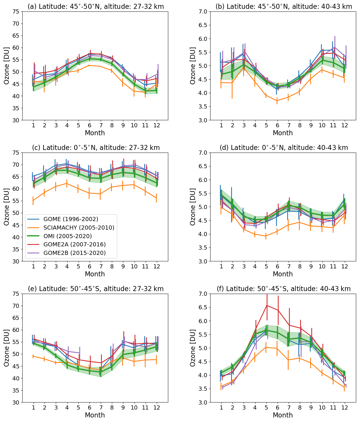 Figure 1Seasonal cycles of ozone partial columns for two layers, 27–32 and 40–43 km, in three latitude bands, 45–50° N (a, b), 0–5° N (c, d), and 45–50° S (e, f), and for five satellite sensors, GOME (blue), SCIAMACHY (orange), OMI (green), GOME-2A (red), and GOME-2B (violet). The error bars denote the 2σ standard deviations. For OMI these are additionally highlighted by the green-shaded area. Note that the seasonal cycles are computed from different time periods (see text and panel c). The longitude bin is always 0–5° E.