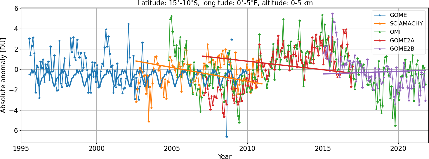 Figure 2Absolute anomalies for GOME (blue), SCIAMACHY (orange), OMI (green), GOME-2A (red), and GOME-2B (purple) as a function of time from 1995 to 2021 for the 10–15° S, 0–5° E latitude–longitude bin and the lowermost altitude layer (0–6 km). The straight lines for SCIAMACHY, GOME-2A, and GOME-2B (orange, red, and purple) denote the results of the linear fits of the offsets between the OMI anomalies and the anomalies from the respective sensor obtained from overlap periods (see text). The thick blue curve denotes the corresponding adjustment derived for GOME.