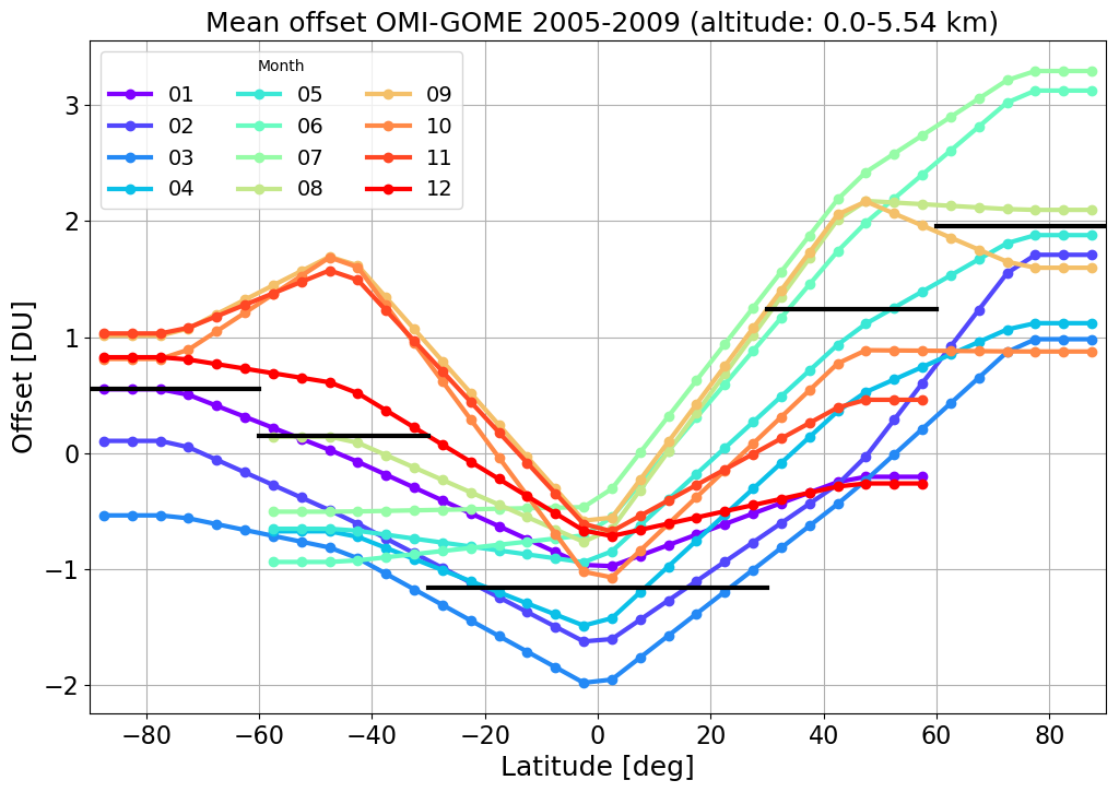 For GOME it is not possible to calculate offsets during the 2005–2009 overlap for each spatial bin, since GOME lost its global coverage in June 2003 due to a permanent technical failure of the onboard tape recorder. Therefore, we can compute offsets during that period for each layer only for spatial bins for which measurements are available. From the time series of the offsets in each available spatial bin, we first calculate averages for each calendar month (“climatologies”) and then average them over five broad latitude bands: 90–60° S, 60–30° S, 30° S–30° N, 30–60° N, and 60–90° N. In the Northern Hemisphere, the GOME data coverage after June 2003 is quite good because of the sufficient number of ground-based receiving stations that ensured data acquisition. On the other hand, in the SH the spatial coverage of the GOME measurements is quite sparse and limited to the areas covered by the German Antarctic Receiving Station O'Higgins (63° S, 54° W), operated by DLR, and the ground station McMurdo (78° S, 167° E), operated by NASA. Thus, poleward of 60° S, the number of grid cells for which GOME measurements are available is rather small. The last step for the computation of the adjustment for GOME is the interpolation of the monthly broad-belt means to each 5° band. Figure 3 shows the final additive correction as a function of latitude and for each calendar month for the lowermost altitude layer. The offset varies from −2 DU (March in the tropics) to +3 DU (June and July in the NH poleward of 60°). In the tropics, the offset is negative during the entire year, whereas it varies between negative and positive values for the middle latitudes of both hemispheres and the southern high latitudes. In the high northern latitudes, the offset is positive throughout the year. Additionally, the black horizontal lines denote the annual average correction for each broadband latitude belt. In Fig. 2 the correction for GOME is denoted by the thick blue curve, which exhibits a seasonal variation around −1 DU.