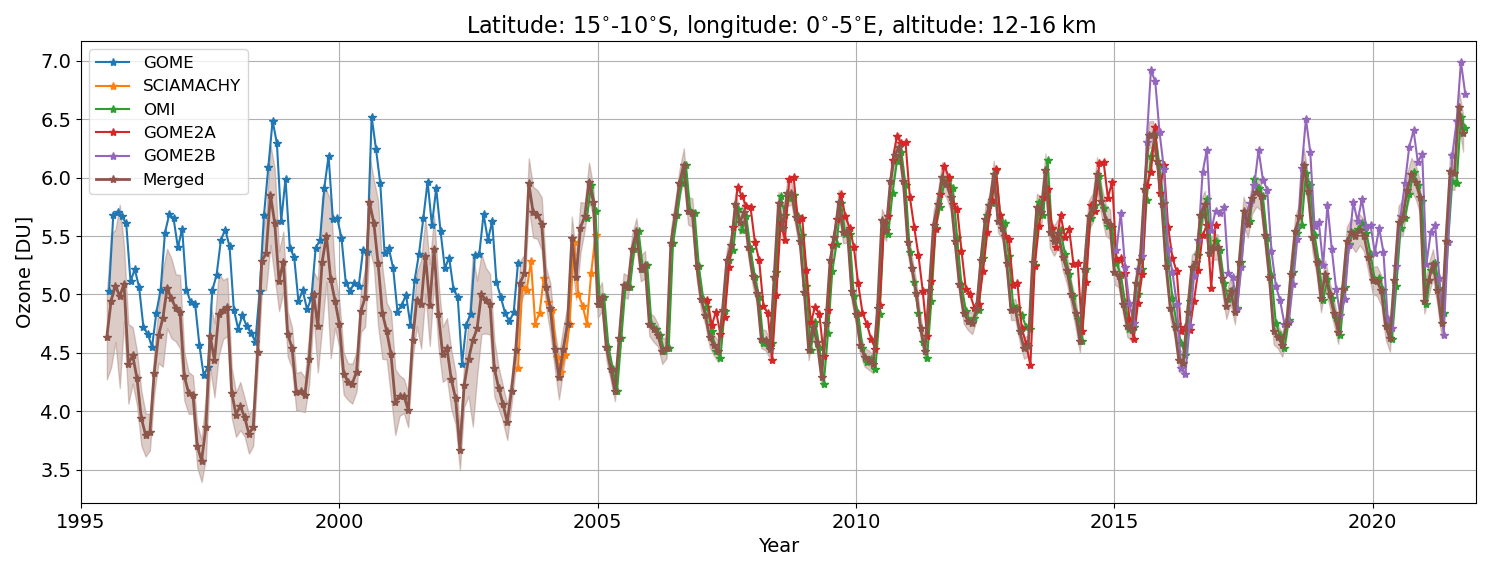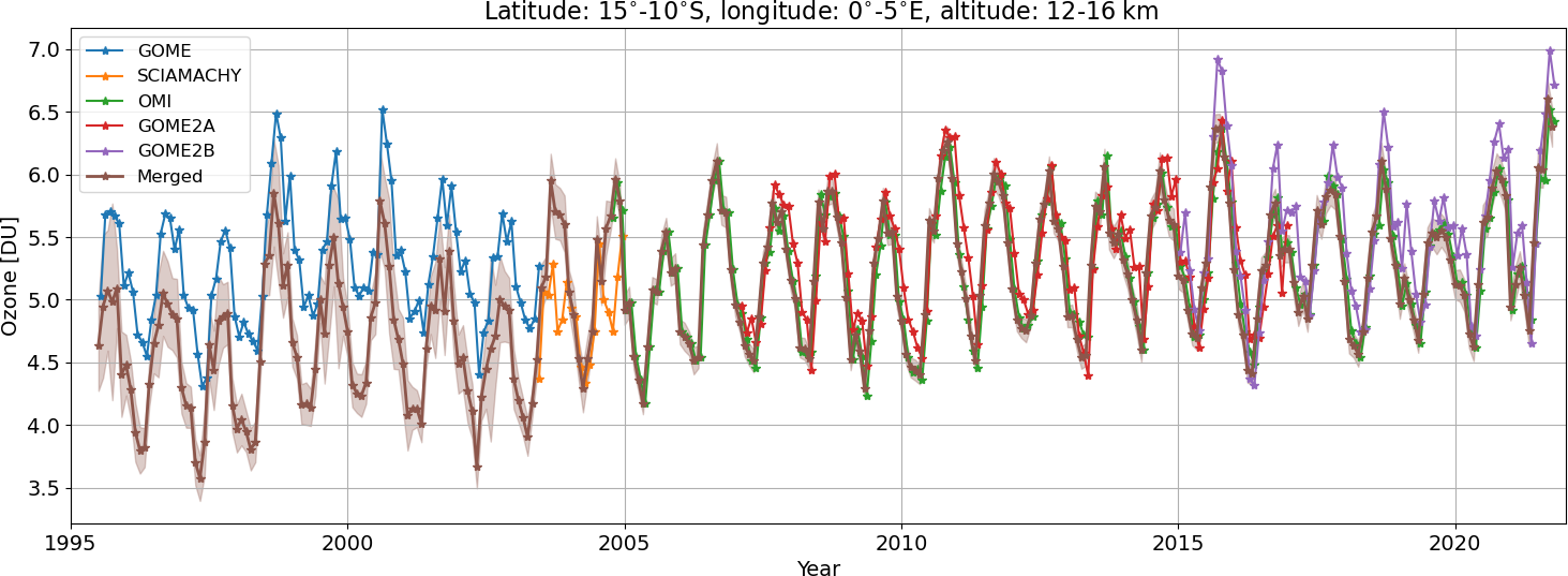 Figure 4 shows the final merged partial column and associated uncertainty as a function of time for the 10–15° S, 0–5° E latitude–longitude bin and the 12–16 km altitude layer (brown curve). Additionally, the original partial columns for GOME (blue), SCIAMACHY (orange), OMI (green), GOME-2A (red), and GOME-2B (purple) are presented. Significant differences between the original product and the merged product are observed for the GOME sensor from 1995 through 2004 due to the bias correction, as described above (negative bias throughout the year for the tropics also for this altitude layer). Merged values from 2004 onward are dominated by the OMI measurements (green), as expected, due to the preceding alignment on the one hand but also to the typically lower uncertainties and therefore higher weights for OMI on the other hand.