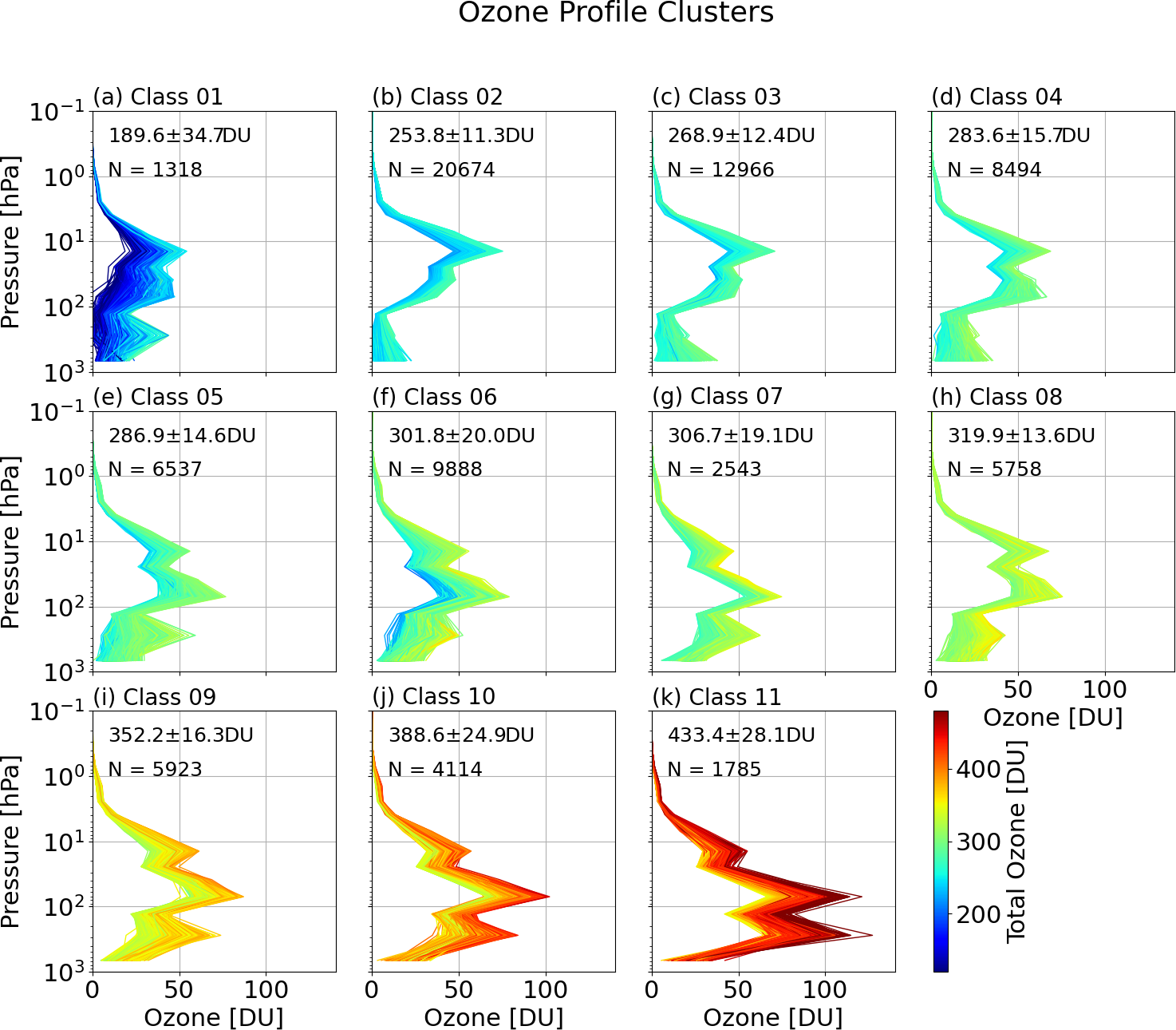 Figure 5Set of 11 classes of ozone profiles, which is the outcome of the clustering procedure. The classes are ordered by the mean total column per class from 189.6 DU in panel (a) to 433.4 DU in panel (k). The mean total column and its 2σ standard deviation are provided in each panel in the top-left corner. Additionally, the total number (N) of profiles in the respective class is given. The color assigned to each individual profile indicates the integrated total ozone column amount.