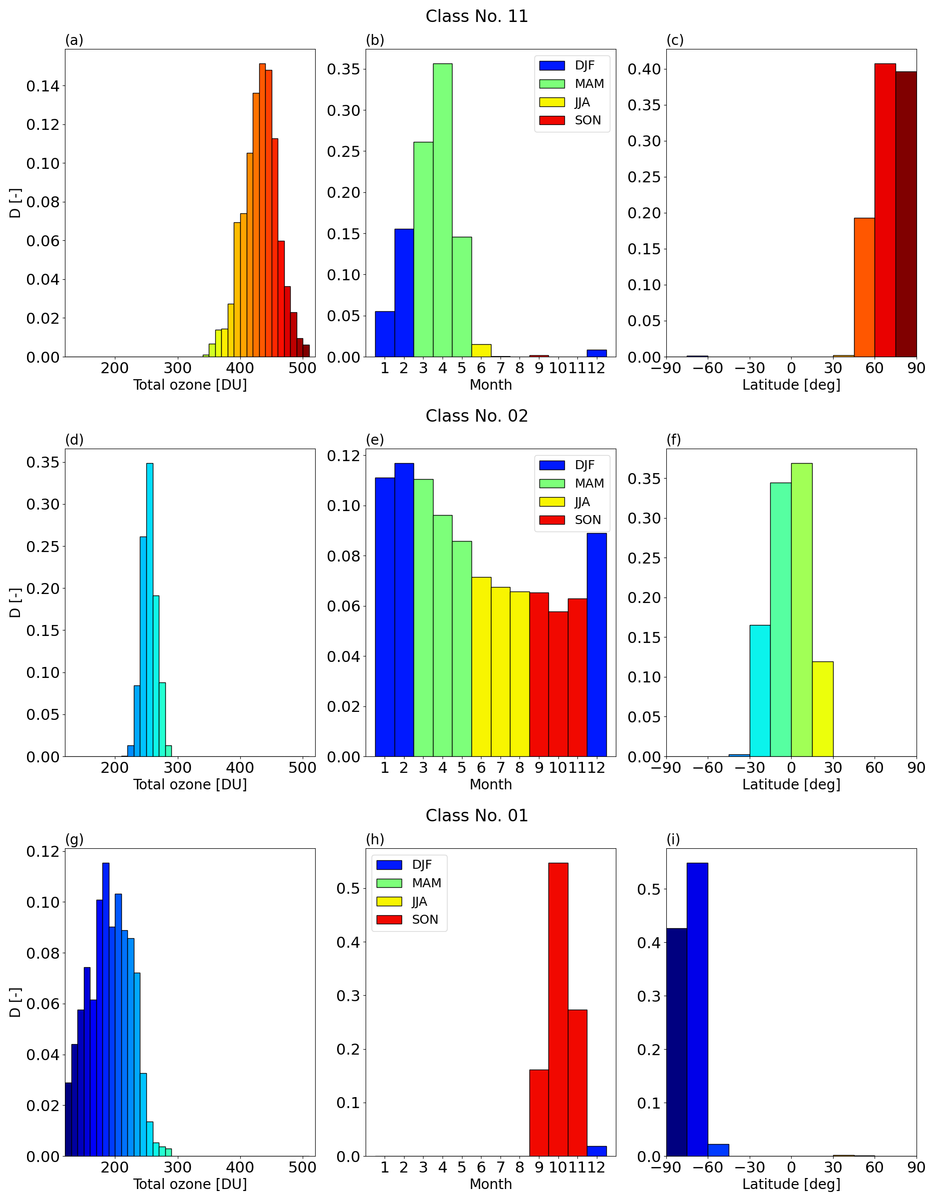 For each class, we analyze its composition with respect to the distribution of the total columns as well as the month and latitude from which the profiles come in more detail. Figure 6 shows these statistics exemplarily for class 11 (a–c), class 02 (d–f), and class 01 (g–i). The distribution of total columns is shown in the left panels (a, d, g), the distribution of the months is shown in the middle panels (b, e, h), and the distribution of the latitudes is shown in the right panels (c, f, i).