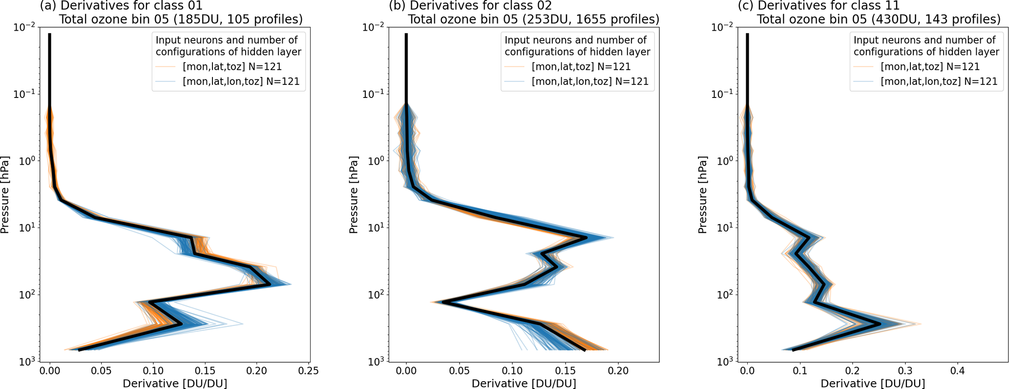 Figure 8Ensemble of derivatives with respect to total ozone as a function of altitude obtained from the NN training for class 01 (a), class 02 (b), and class 11 (c). The thick black lines denote the ensemble's median derivative. Blue and orange curves correspond to single network configurations with either three (blue) or four (orange) input neurons and different configurations of neurons in the two hidden layers (see also Table 3). For each class, the complete ensemble consists of 242 members.