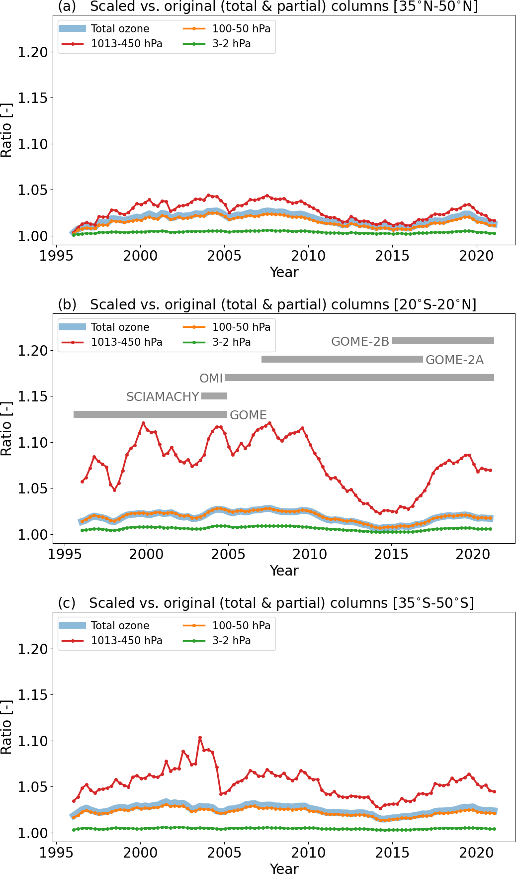 Figure 11Ratio of scaled and original ozone as a function of time (1995–2021) for three latitude bands: (a) 35–50° N, (b) 20° S–20° N, and (c) 35–50° S. A 12-month running mean was applied. The ratio is shown for the total ozone column (thick blue curve), and the partial ozone columns in the layers surface–450 hPa (red), 100–50 hPa (orange), and 3–2 hPa (green). Additionally, the grey horizontal bars in panel (b) indicate the period for each sensor included in the merged product.