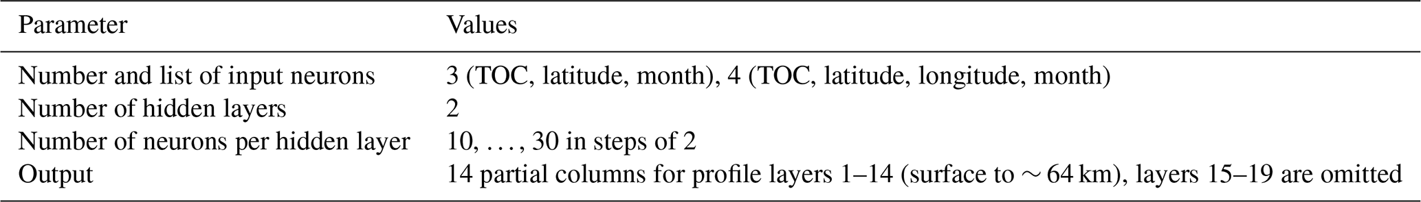For our purpose, i.e., the development of an altitude-dependent scaling, we need to obtain a rather robust estimate of the derivatives with respect to the total columns. This can be achieved by compiling an ensemble of NNs (Loyola, 2006), each of which provides derivatives that can be extracted. Finally, the ensemble's median derivative is used for the scaling task which is described in the next section. Based on the results of the performance study conducted in advance, the ensemble of NNs consists of the following configurations (see also Table 3): in the input layer, 3 and 4 neurons are used, the number of hidden layers is set to 2, and the number of neurons in each hidden layer is varied from 10 to 30 in steps of 2. The total number of members in the ensemble of NNs is 242. In contrast to the performance study, the number of output neurons is reduced to 14, which means that only the 14 lowermost profile layers from the surface to ∼ 64 km are used. Since the amount of ozone above 64 km is only about 0.02 % of the total column, we decided to omit these layers from the scaling so that they would remain unchanged while scaling the other layers.
