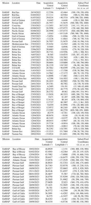 Table C2List of the collected EMIT acquisitions capturing offshore areas. The date information is in DD/MM/YYYY format. xi, yi, xe, ye are the pixel coordinates describing the initial (i) and final (e) rows (x) and columns (y) from the selected subsets of the scene. The latitude and longitude indicate the center coordinates of the entire acquisition and therefore do not match the subset coordinates.