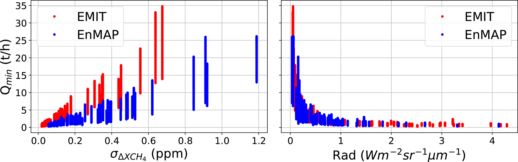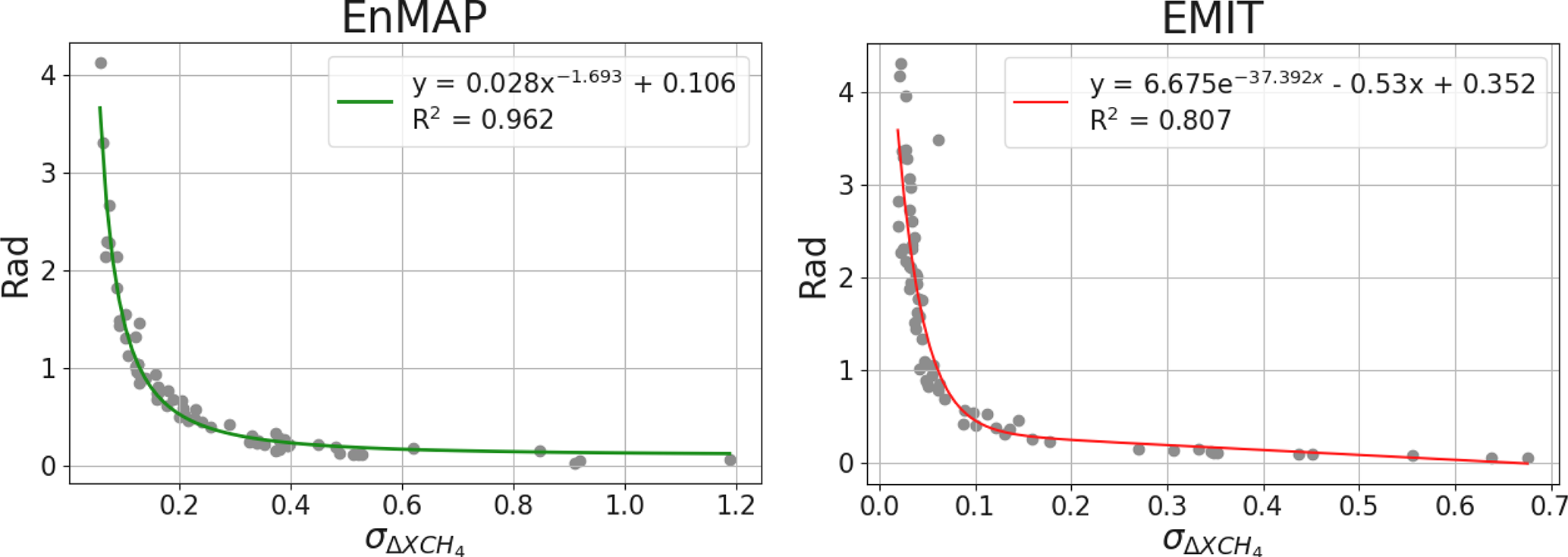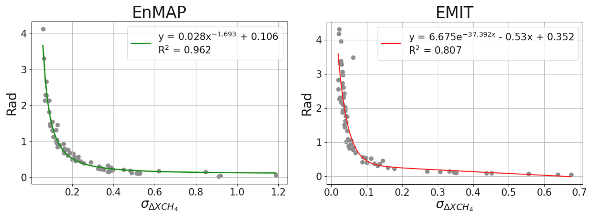 In Fig. 7, we show the relationship between Rad and several parameters for every acquisition listed in Tables and , obtained using the EnMAP (left) and EMIT (right) instruments, respectively. There is a clear exponential trend between Rad and (green) that drives methane retrieval precision. Acquisitions with higher Rad values benefit from a better retrieval precision, which improves the emission detection performance. At the same Rad levels, EMIT outperforms the retrieval precision in comparison to that of EnMAP due to a higher SNR (blue), which can be attributed to the lower spatial resolution.