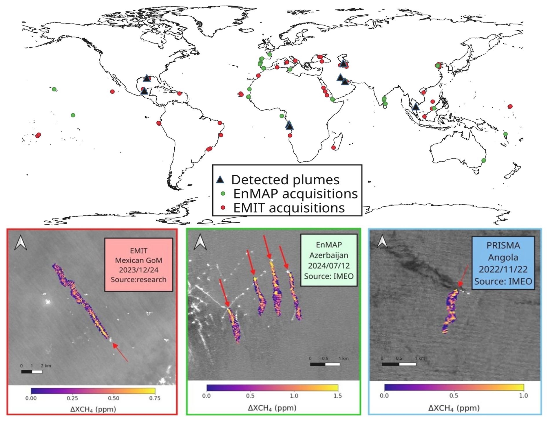 Figure 6In top panel, locations from the EnMAP (green dots) and EMIT (red dots) acquisitions of Tables and and from the methane plumes (black triangles) detected using EnMAP, PRISMA, and EMIT data of Table B1. In the bottom panel, examples of detected plumes overlaid on radiance maps are shown using data from EnMAP (framed in green), EMIT (framed in red), and PRISMA (framed in blue).