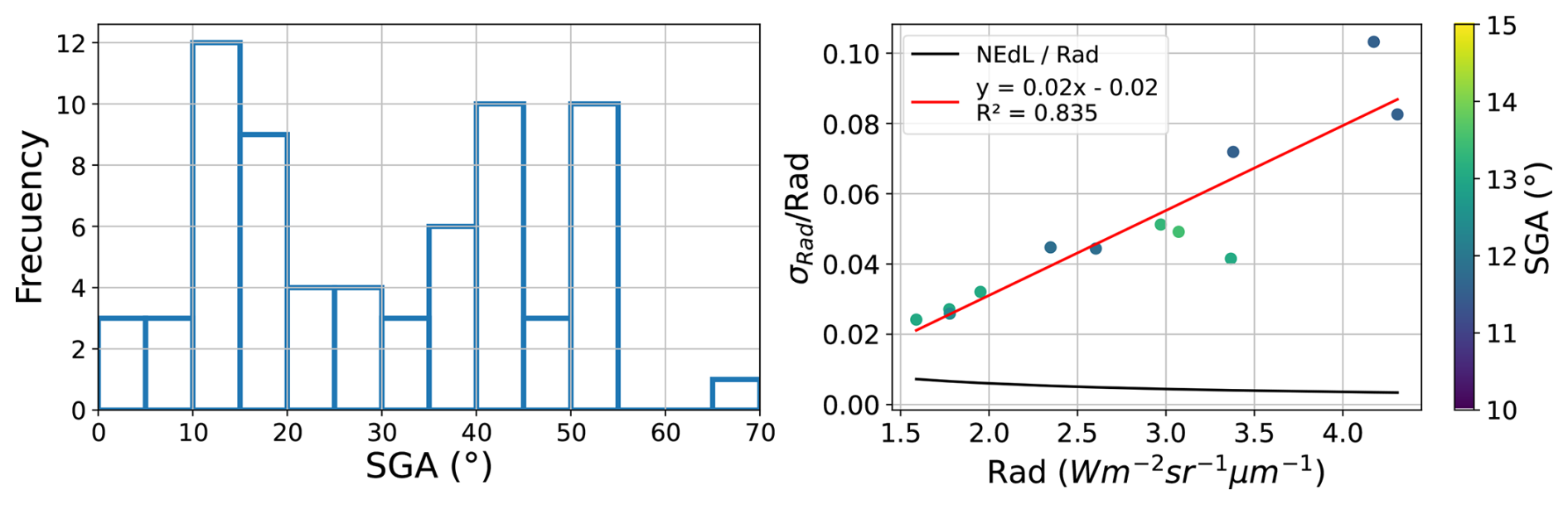 Figure 9Histogram showing the SGA distribution from the EMIT acquisitions from Table (left) and the scatter plot of Rad against from those EnMAP points with SGA values ranging from 10 to 15° (right), where a higher density of data is located. A normalized NEdL curve (black) and a linear fit to the data points (red) are also illustrated.