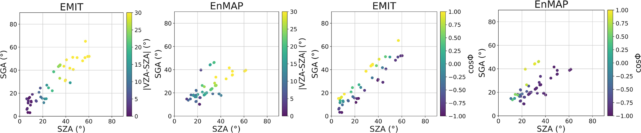 Due to the relatively low VZA values from the EnMAP and EMIT instruments, there is a positive correlation between SZA and SGA (see Eq. 3), which generally leads to closer-to-sun glint acquisitions at lower SZA. Moreover, at the same SZA, EnMAP exhibits more flexibility to achieve this configuration as it has the ability to point in the across-track direction. A more detailed analysis can be found in Appendix D.
