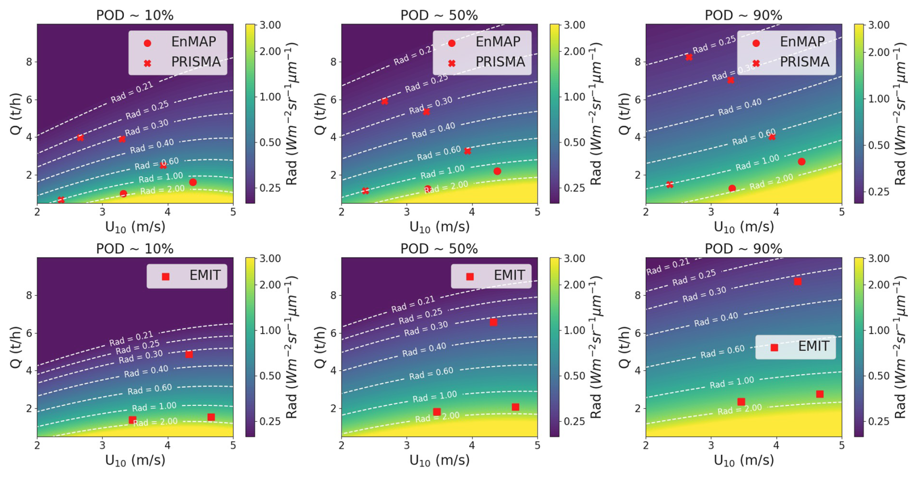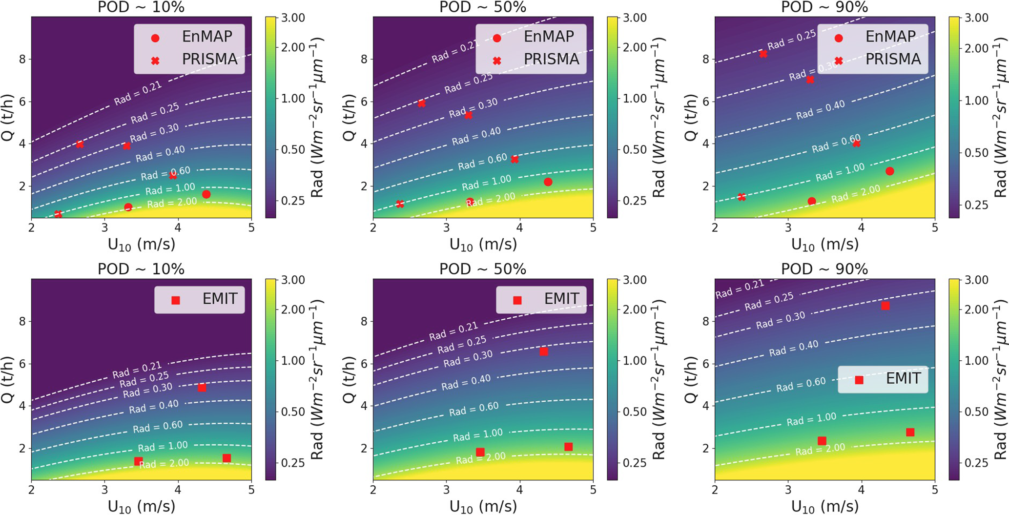 Due to the low temporal resolution of the PRISMA, EnMAP, and EMIT imaging spectrometers, a joint use of these missions will increase the probability to detect point source emissions in an area with potential emitters. Once data have been acquired, using radiance levels from the ∼ 2131 nm bands and the wind speed values from products such as GEOS-FP, will provide the flux rate related to the POD models (see Appendix F). This will allow to keep or discard images for plume detection after setting a criteria provided by the user, such as a flux rate threshold. Similarly, if we have the methane enhancement concentration retrievals, we could repeat the same exercise but using the results from Fig. 10.