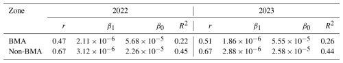 Table 4Pearson correlation coefficient (r), slope (β1), intercept (β0), and coefficient of determination (R2) for NO2 levels in BMA and non-BMA zones during 2022–2023. Calculations are based on daily satellite data matched with surface NO2 measurements recorded at 13:00 UTC.